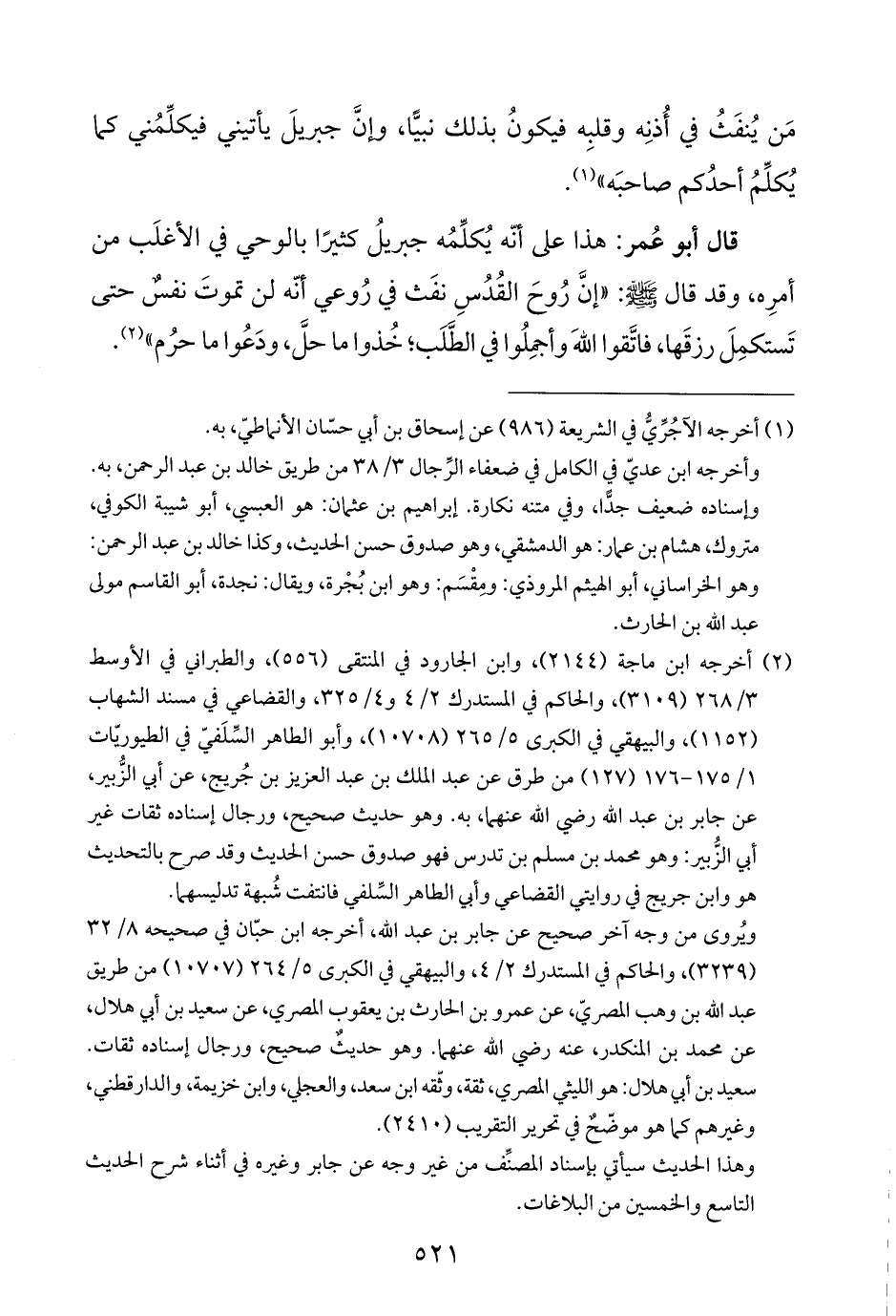 قال أبو عُمر: هذا على أنَّه يُكلِّمُه جبريلُ كثيرًا بالوحي في الأغلَب من أمرِه، وقد قال -صلى اللَّه عليه وسلم-: "إنَّ رُوحَ القُدُسِ نفَث في رُوعي أنّه لن تموتَ نفسٌ حتى تَستكمِلَ رزقَها، فاتَّقوا اللَّهَ وأجمِلُوا في الطَّلَب؛ خُذوا ما حلَّ، ودَعُوا ما حرُم" (¬٢).
