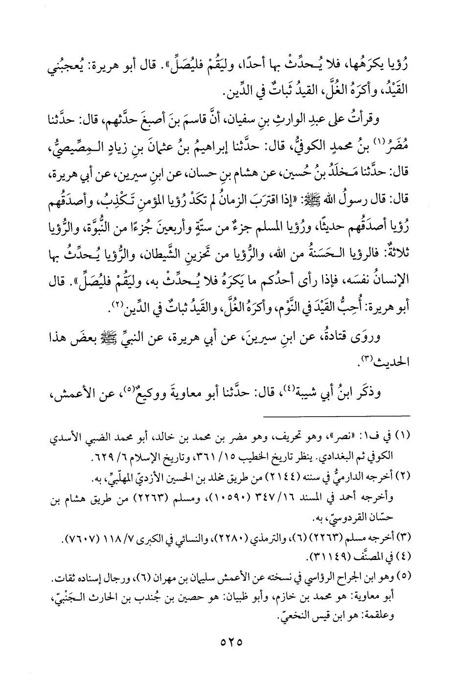 وقرأتُ على عبدِ الوارثِ بنِ سفيان، أنَّ قاسمَ بنَ أصبغَ حدَّثهم، قال: حدَّثنا مُضَرُ (¬١) بنُ محمدٍ الكوفيُّ، قال: حدَّثنا إبراهيمُ بنُ عثمانَ بنِ زيادٍ المِصِّيصيُّ، قال: حدَّثنا مَخلَدُ بنُ حُسين، عن هشام بنِ حسان، عن ابنِ سيرين، عن أبي هريرة، قال: قال رسولُ اللَّه -صلى اللَّه عليه وسلم-: "إذا اقترَبَ الزمانُ لم تكَدْ رُؤيا المؤمنِ تَكْذِبُ، وأصدَقُهم رُؤيا أصدَقُهم حديثًا، ورُؤيا المسلم جزءٌ من ستّةٍ وأربعينَ جُزءًا من النُّبوَّة، والرُّؤيا ثلاثةٌ: فالرؤيا الحَسَنةُ من اللَّه، والرُّؤيا من تَحزينِ الشَّيطان، والرُّؤيا يُحدِّثُ بها الإنسانُ نفسَه، فإذا رأى أحدُكم ما يَكرَهُ فلا يُحدِّثْ به، وليَقُمْ فليُصلِّ". قال أبو هريرة: أُحِبُّ القَيْدَ في النَّوْم، وأكرَهُ الغُلَّ، والقَيدُ ثباتٌ في الدِّين (¬٢).