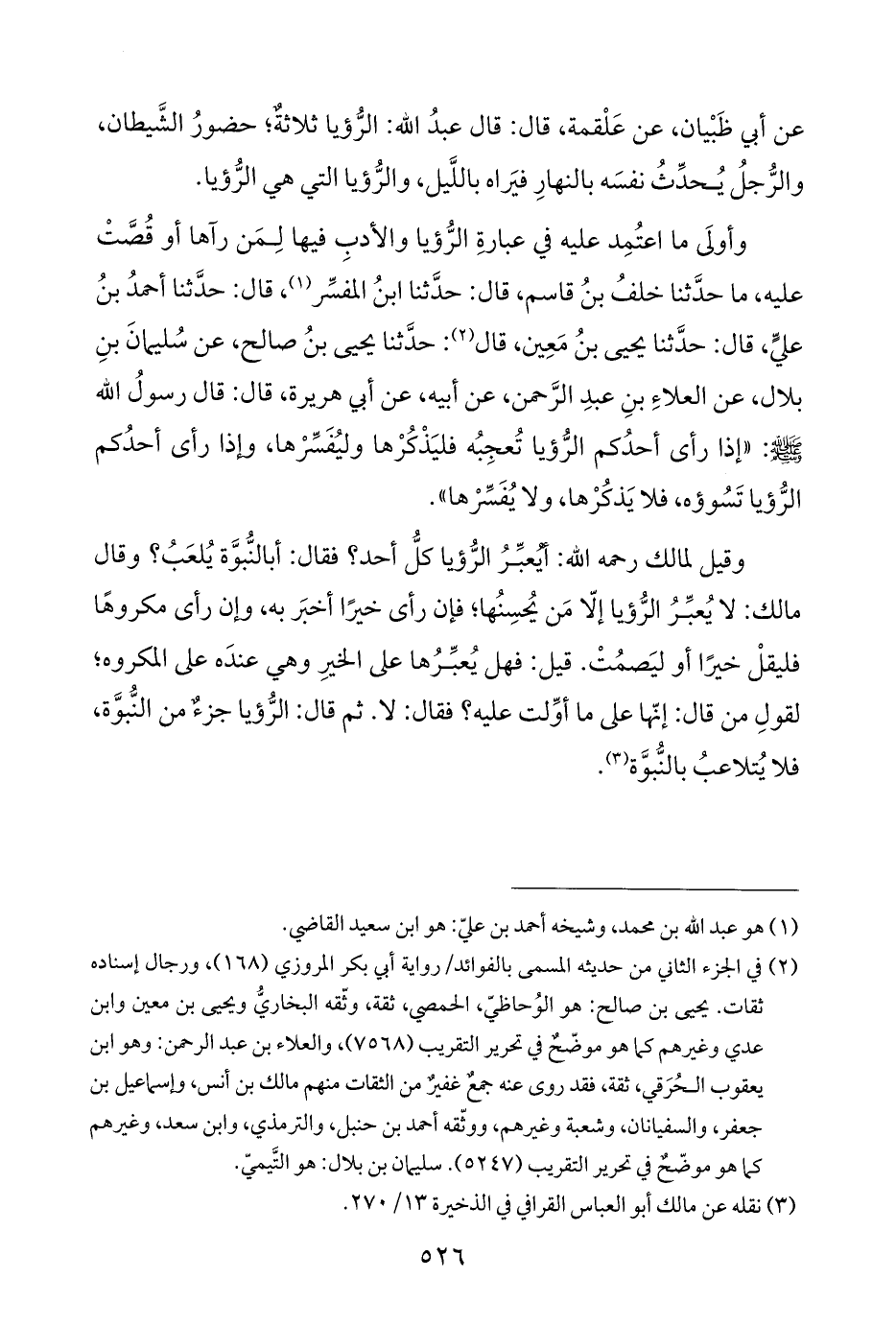 وأولَى ما اعتُمِد عليه في عبارةِ الرُّؤيا والأدبِ فيها لِمَن رآها أو قُصَّتْ عليه، ما حدَّثنا خلفُ بنُ قاسم، قال: حدَّثنا ابنُ المفسِّر (¬١)، قال: حدَّثنا أحمدُ بنُ عليٍّ، قال: حدَّثنا يحيى بنُ مَعِين، قال (¬٢): حدَّثنا يحيى بنُ صالح، عن سُليمانَ بنِ بلال، عن العلاءِ بنِ عبدِ الرَّحمن، عن أبيه، عن أبي هريرة، قال: قال رسولُ اللَّه -صلى اللَّه عليه وسلم-: "إذا رأى أحدُكم الرُّؤيا تُعجِبُه فليَذْكُرْها وليُفَسِّرْها، وإذا رأى أحدُكم الرُّؤيا تَسُوؤه، فلا يَذكُرْها، ولا يُفَسِّرْها".