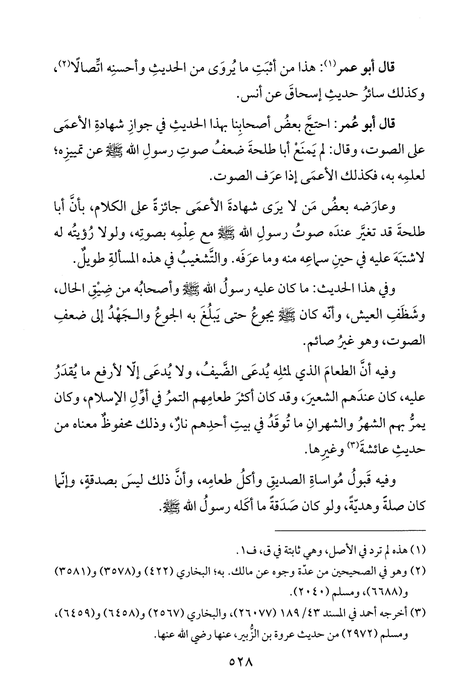 وعارَضه بعضُ مَن لا يرَى شهادةَ الأعمَى جائزةً على الكلام، بأنَّ أبا طلحةَ قد تغيَّر عندَه صوتُ رسولِ اللَّه -صلى اللَّه عليه وسلم- مع عِلْمِه بصوتِه، ولولا رُؤيتُه له لاشتبَهَ عليه في حينِ سماعِه منه وما عرَفَه. والتَّشغيبُ في هذه المسألةِ طويلٌ.