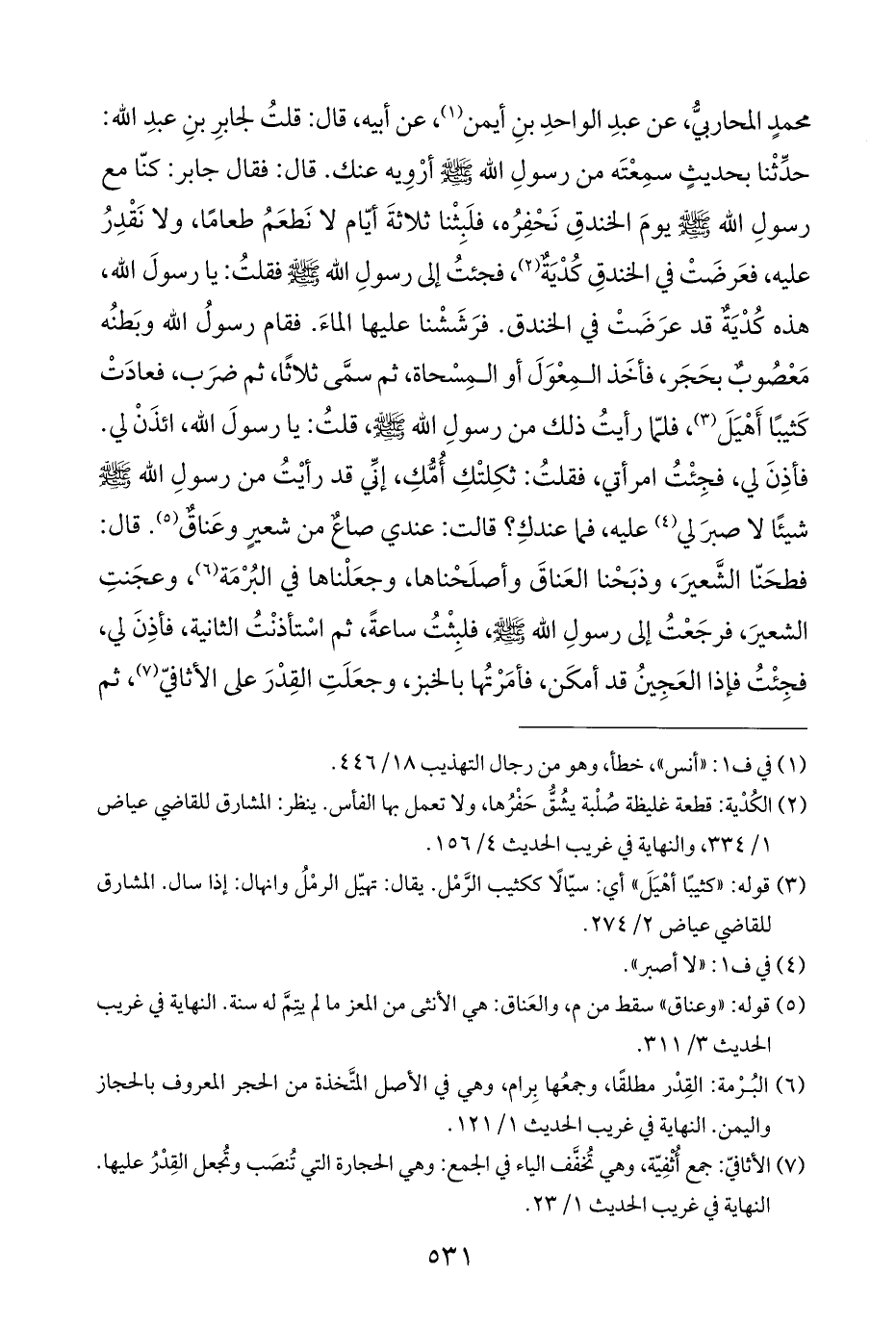محمدٍ المحاربيُّ، عن عبدِ الواحدِ بنِ أيمن (¬١)، عن أبيه، قال: قلتُ لجابرِ بنِ عبدِ اللَّه: حدِّثْنا بحديثٍ سمِعْتَه من رسولِ اللَّه -صلى اللَّه عليه وسلم- أرْوِيه عنك. قال: فقال جابر: كنّا مع رسولِ اللَّه -صلى اللَّه عليه وسلم- يومَ الخندقِ نَحْفِرُه، فلَبِثْنا ثلاثةَ أيّام لا نَطعَمُ طعامًا، ولا نَقْدِرُ عليه، فعَرضَتْ في الخندقِ كُدْيَةٌ (¬٢)، فجئتُ إلى رسولِ اللَّه -صلى اللَّه عليه وسلم- فقلتُ: يا رسولَ اللَّه، هذه كُدْيَةٌ قد عرَضَتْ في الخندق. فرَشَشْنا عليها الماءَ. فقام رسولُ اللَّه وبَطنُه مَعْصوبٌ بحَجَر، فأخَذ المِعْوَلَ أو المِسْحاة، ثم سمَّى ثلاثًا، ثم ضرَب، فعادَتْ كَثيبًا أَهْيَلَ (¬٣)، فلمّا رأيتُ ذلك من رسولِ اللَّه -صلى اللَّه عليه وسلم-، قلتُ: يا رسولَ اللَّه، ائذَنْ لي. فأذِنَ لي، فجِئْتُ امرأتي، فقلتُ: ثكِلتْكِ أُمُّكِ، إنِّي قد رأيْتُ من رسولِ اللَّه -صلى اللَّه عليه وسلم- شيئًا لا صبرَ لي (¬٤) عليه، فما عندكِ؟ قالت: عندي صاعٌ من شعيرٍ وعَناقٌ (¬٥). قال: فطحَنّا الشَّعيرَ، وذبَحْنا العَناقَ وأصلَحْناها، وجعَلْناها في البُرْمَة (¬٦)، وعجَنتِ الشعيرَ، فرجَعْتُ إلى رسولِ اللَّه -صلى اللَّه عليه وسلم-، فلبِثْتُ ساعةً، ثم اسْتأذنْتُ الثانية، فأذِنَ لي، فجِئْتُ فإذا العَجِينُ قد أمكَن، فأمَرْتُها بالخبز، وجعَلَتِ القِدْرَ على الأثافيّ (¬٧)، ثم