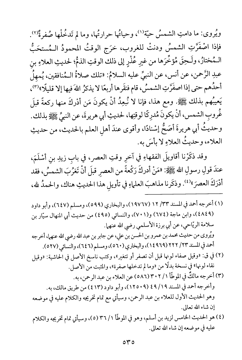 ويُروى: ما دامتِ الشمسُ حيّة (¬١)، وحياتُها حرارتُها، وما لم تَدخُلْها صُفرةٌ (¬٢). فإذا اصْفَرَّتِ الشمسُ ودنتْ للغروب، خرَج الوقتُ المحمودُ المُستحَبُّ المُختارُ، ولَحِقَ مُؤخِّرَها من غيرِ عُذْرٍ إلى ذلك الوقتِ الذمُّ؛ لحديثِ العلاءِ بنِ عبدِ الرَّحمن، عن أنس، عن النبيِّ عليه السلامُ: "تلك صلاةُ المُنافقين، يُمهِلُ أحدُهم حتى إذا اصفَرَّتِ الشمسُ، قام فنقَرها أربعًا لا يذكرُ اللَّهَ فيها إلَّا قليلًا" (¬٣)، يَعيبُهم بذلك -صلى اللَّه عليه وسلم-. ومع هذا، فإنا لا نُبعِدُ أنْ يكونَ مَن أدْركَ منها ركعةً قبلَ غُروبِ الشمس، أنْ يكونَ مُدرِكًا لوقتِها، لحديثِ أبي هريرةَ، عن النبيِّ -صلى اللَّه عليه وسلم- بذلك. وحديثُ أبي هريرةَ أصَحُّ إسْنادًا، وأقوى عندَ أهلِ العلم بالحديث، من حديثِ العلاء، وحديثُ العلاءِ لا بأسَ به.