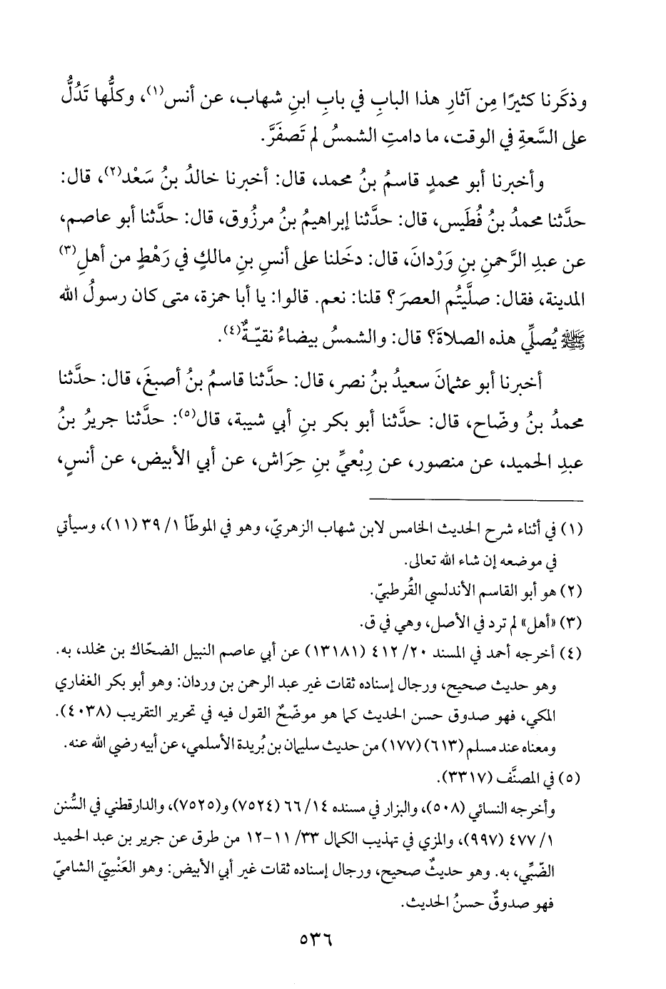 وأخبرنا أبو محمدٍ قاسمُ بنُ محمد، قال: أخبرنا خالدُ بنُ سَعْد (¬٢)، قال: حدَّثنا محمدُ بنُ فُطَيس، قال: حدَّثنا إبراهيمُ بنُ مرزُوق، قال: حدَّثنا أبو عاصم، عن عبدِ الرَّحمنِ بنِ وَرْدانَ، قال: دخَلنا على أنَّسِ بنِ مالكٍ في رَهْطٍ من أهلِ (¬٣) المدينة، فقال: صلَّيتُم العصرَ؟ قلنا: نعم. قالوا: يا أبا حمزة، متى كان رسولُ اللَّه -صلى اللَّه عليه وسلم- يُصلِّي هذه الصلاةَ؟ قال: والشمسُ بيضاءُ نقيّةٌ (¬٤).