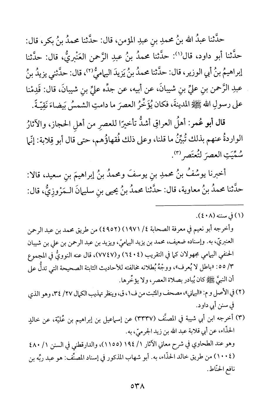 حدَّثنا عبدُ اللَّه بنُ محمدِ بنِ عبدِ المؤمن، قال: حدَّثنا محمدُ بنُ بكر، قال: حدَّثنا أبو داود، قال (¬١): حدَّثنا محمدُ بنُ عبدِ الرَّحمن العَنْبريُّ، قال: حدَّثنا إبراهيمُ بنُ أبي الوزير، قال: حدَّثنا محمدُ بنُ يَزيدَ اليماميُّ (¬٢)، قال: حدَّثني يزيدُ بنُ عبدِ الرَّحمن بنِ عليِّ بنِ شيبانَ، عن أبيه، عن جدِّه عليِّ بنِ شيبانَ، قال: قَدِمْنا على رسولِ اللَّه -صلى اللَّه عليه وسلم- المدينةَ، فكان يُؤَخِّرُ العصرَ ما دامتِ الشمسُ بَيضاءَ نَقِيّةً.