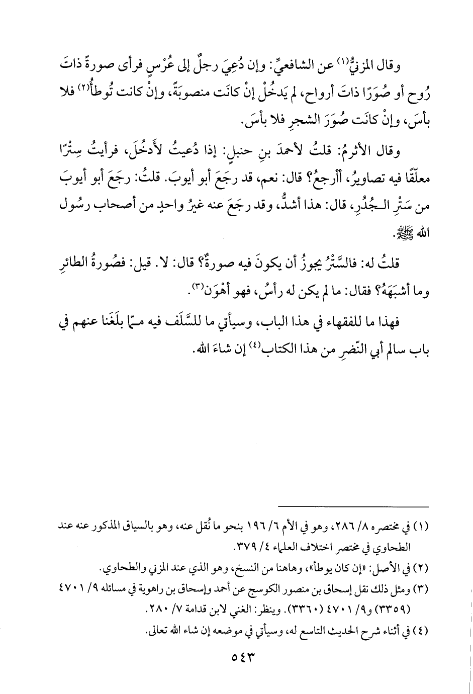 وقال الأثرمُ: قلتُ لأحمدَ بنِ حنبلٍ: إذا دُعيتُ لأَدخُلَ، فرأيتُ سِتْرًا معلّقًا فيه تصاويرُ، أأرجعُ؟ قال: نعم، قد رجَعَ أبو أيوبَ. قلتُ: رجَعَ أبو أيوبَ من سَتْرِ الجُدُرِ، قال: هذا أشدُّ، وقد رجَعَ عنه غيرُ واحدٍ من أصحاب رسُول اللَّه -صلى اللَّه عليه وسلم-.