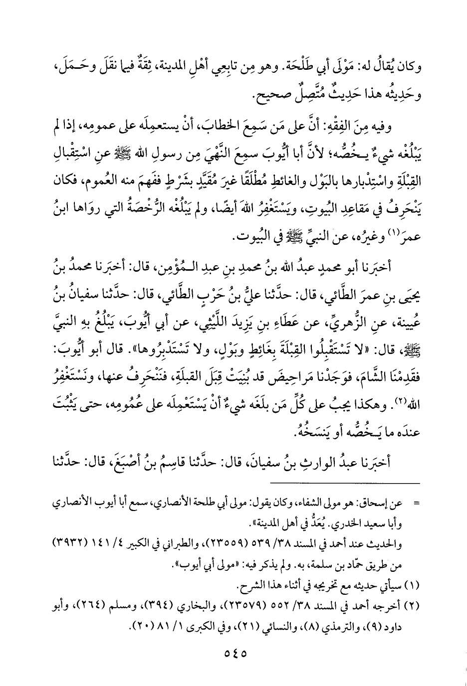 أخبَرنا أبو محمدٍ عبدُ اللَّه بنُ محمدِ بنِ عبدِ المُؤْمِن، قال: أخبَرنا محمدُ بنُ يحيَى بنِ عمرَ الطَّائي، قال: حدَّثنا عليُّ بنُ حَرْبٍ الطَّائي، قال: حدَّثنا سفيانُ بنُ عُيينة، عنِ الزُّهريِّ، عن عَطَاءِ بنِ يَزِيدَ اللَّيْثِي، عن أبي أيُّوبَ، يَبْلُغُ بهِ النبيَّ -صلى اللَّه عليه وسلم-، قال: "لا تَسْتَقْبِلُوا القِبْلَةَ بِغَائِطٍ وبَوْلٍ، ولا تَسْتَدْبِرُوها". قال أبو أيُّوبَ: فقَدِمْنَا الشَّامَ، فوَجَدْنا مَراحِيضَ قد بُنِيَتْ قِبَلَ القبلَةِ، فنَنْحَرِفُ عنها، ونَسْتَغْفِرُ اللَّه (¬٢). وهكذا يجبُ على كُلِّ مَن بلَغَه شئٌ أنْ يَسْتَعْمِلَه على عُمُومِه، حتى يَثْبُتَ عندَه ما يَخُصُّه أو يَنسَخُهُ.