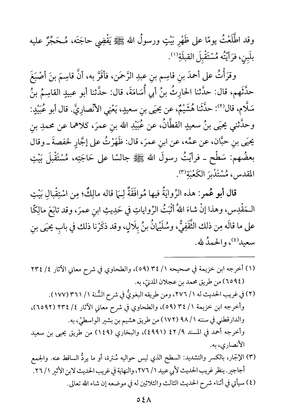 وقرَأْتُ على أحمدَ بنِ قاسِم بنِ عبدِ الرَّحمَن، فأقَرَّ به، أنَّ قاسِمَ بنَ أصْبَغَ حدَّثَهم، قال: حدَّثنا الحارِثُ بنُ أبي أُسَامَةَ، قال؛ حدَّثنا أبو عبيدٍ القاسِمُ بنُ سَلَّام، قال (¬٢): حدَّثَنا هُشَيْمٌ، عن يحيَى بنِ سعيدٍ، يَعْنِي الأنْصارِيَّ. قال أبو عُبَيْدٍ: وحدَّثني يحيَى بنُ سعيدٍ القطَّانُ، عن عُبَيْدِ اللَّه بنِ عمرَ، كلاهما عن محمدِ بنِ يحيَى بنِ حبَّان، عن عمِّه، عن ابنِ عمرَ، قال: ظَهَرْتُ على إجَّارٍ لحفصةَ -وقال بعضُهم: سَطْح- فرأيْتُ رسولَ اللَّه -صلى اللَّه عليه وسلم- جالسًا على حَاجَتِه، مُسْتَقْبلَ بَيْتِ المقدس، مُسْتَدْبرَ الكَعْبَةِ (¬٣).