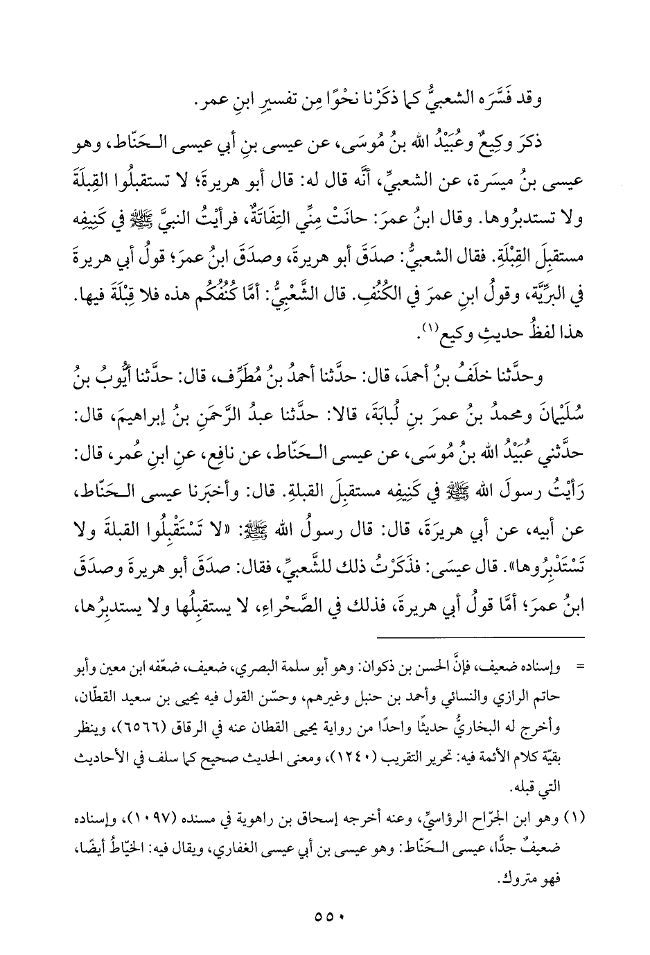 ذكرَ وكِيعٌ وعُبَيْدُ اللَّه بنُ مُوسَى، عن عيسى بنِ أبي عيسى الحَنّاط، وهو عيسى بنُ ميسَرة، عن الشعبيِّ، أنَّه قال له: قال أبو هريرةَ؛ لا تستقبلُوا القِبلَةَ ولا تستدبرُوها. وقال ابنُ عمرَ: حانَتْ مِنِّي التِفَاتَةٌ، فرأيْتُ النبيَّ -صلى اللَّه عليه وسلم- في كَنِيفِه مستقبِلَ القِبْلَةِ. فقال الشعبيُّ: صدَقَ أبو هريرةَ، وصدَقَ ابنُ عمرَ؛ قولُ أبي هريرةَ في البرِّيَّة، وقولُ ابنِ عمرَ في الكُنُفِ. قال الشَّعْبِيُّ: أمَّا كُنُفُكُم هذه فلا قِبْلَةَ فيها. هذا لفظُ حديثِ وكيع (¬١).