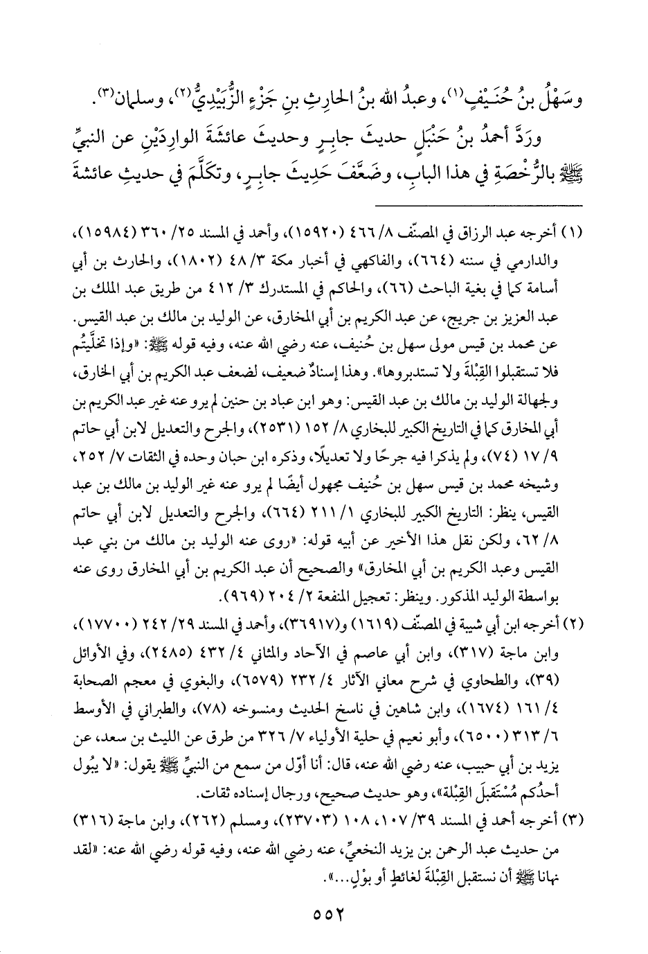 (¬١) أخرجه عبد الرزاق في المصنّف ٨/ ٤٦٦ (١٥٩٢٠)، وأحمد في المسند ٢٥/ ٣٦٠ (١٥٩٨٤)، والدارمي في سننه (٦٦٤)، والفاكهي في أخبار مكة ٣/ ٤٨ (١٨٠٢)، والحارث بن أبي أسامة كما في بغية الباحث (٦٦)، والحاكم في المستدرك ٣/ ٤١٢ من طريق عبد الملك بن عبد العزيز بن جريج، عن عبد الكريم بن أبي المخارق، عن الوليد بن مالك بن عبد القيس. عن محمد بن قيس مولى سهل بن حُنيف، عنه رضي اللَّه عنه، وفيه قوله -صلى اللَّه عليه وسلم-: "وإذا تخلَّيتُم فلا تستقبلوا القِبْلةَ ولا تستدبروها". وهذا إسنادٌ ضعيف، لضعف عبد الكريم بن أبي الخارق، ولجهالة الوليد بن مالك بن عبد القيس: وهو ابن عباد بن حنين لم يرو عنه غير عبد الكريم بن أبي المخارق كما في التاريخ الكبير للبخاري ٨/ ١٥٢ (٢٥٣١)، والجرح والتعديل لابن أبي حاتم ٩/ ١٧ (٧٤)، ولم يذكرا فيه جرحًا ولا تعديلًا، وذكره ابن حبان وحده في الثقات ٧/ ٢٥٢، وشيخه محمد بن قيس سهل بن حُنيف مجهول أيضًا لم يرو عنه غير الوليد بن مالك بن عبد القيس، ينظر: التاريخ الكبير للبخاري ١/ ٢١١ (٦٦٤)، والجرح والتعديل لابن أبي حاتم ٨/ ٦٢، ولكن نقل هذا الأخير عن أبيه قوله: "روى عنه الوليد بن مالك من بني عبد القيس وعبد الكريم بن أبي المخارق" والصحيح أن عبد الكريم بن أبي المخارق روى عنه بواسطة الوليد المذكور. وينظر: تعجيل المنفعة ٢/ ٢٠٤ (٩٦٩).