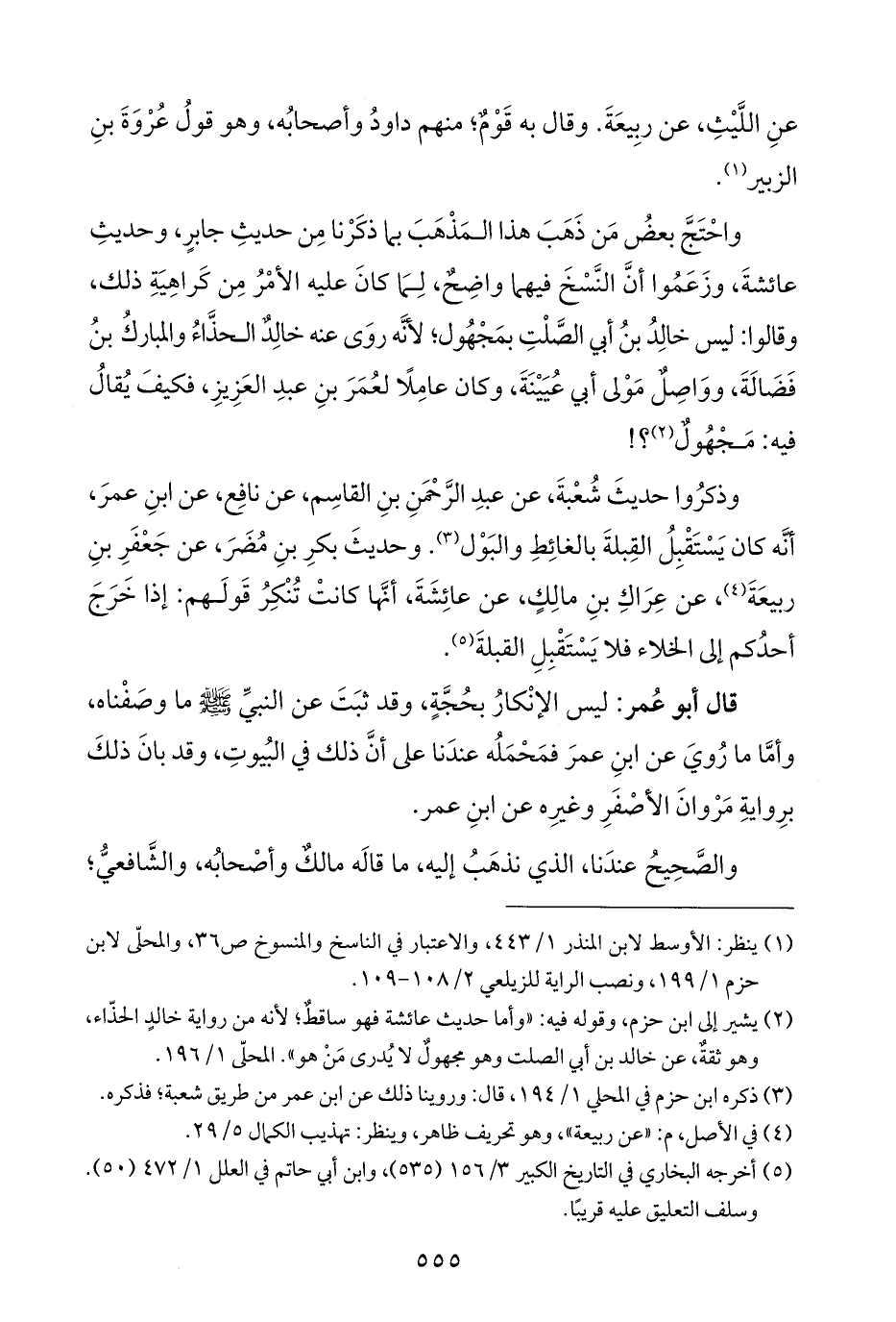 (¬٢) يشير إلى ابن حزم، وقوله فيه: "وأما حديث عائشة فهو ساقطٌ؛ لأنه من رواية خالدٍ الحذّاء، وهو ثقة، عن خالد بن أبي الصلت وهو مجهولٌ لا يُدرى مَنْ هو". المحلّى ١/ ١٩٦.