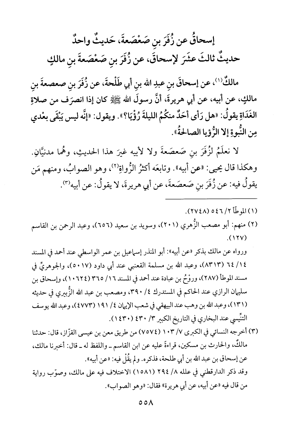 مالكٌ (¬١)، عن إسحاقَ بنِ عبدِ اللَّه بنِ أبي طَلْحةَ، عن زُفَرَ بنِ صعصعةَ بنِ مالكٍ، عن أبيه، عن أبي هريرةَ، أنَّ رسولَ اللَّه -صلى اللَّه عليه وسلم- كان إذا انصرَف من صلاةِ الغَدَاةِ يقولُ: "هل رَأى أحَدٌ منكُمُ الليلةَ رُؤْيَا؟ ". ويقول: "إنَّه ليس يَبْقَى بعْدي مِن النُّبوةِ إلا الرُّؤيا الصالحةُ".