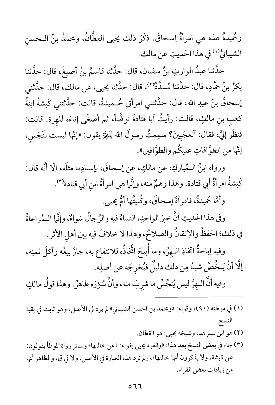 (¬٣) جاء في بعض النسخ بعد هذا: "وانفرد يحيى بقوله: "عن خالتها" وسائر رواة الموطأ يقولون: عن كبشة، ولا يذكرون أنها خالتها"، ولم ترد هذه العبارة في الأصل، ولا في ق، والظاهر أنها من زيادات بعض القراء.