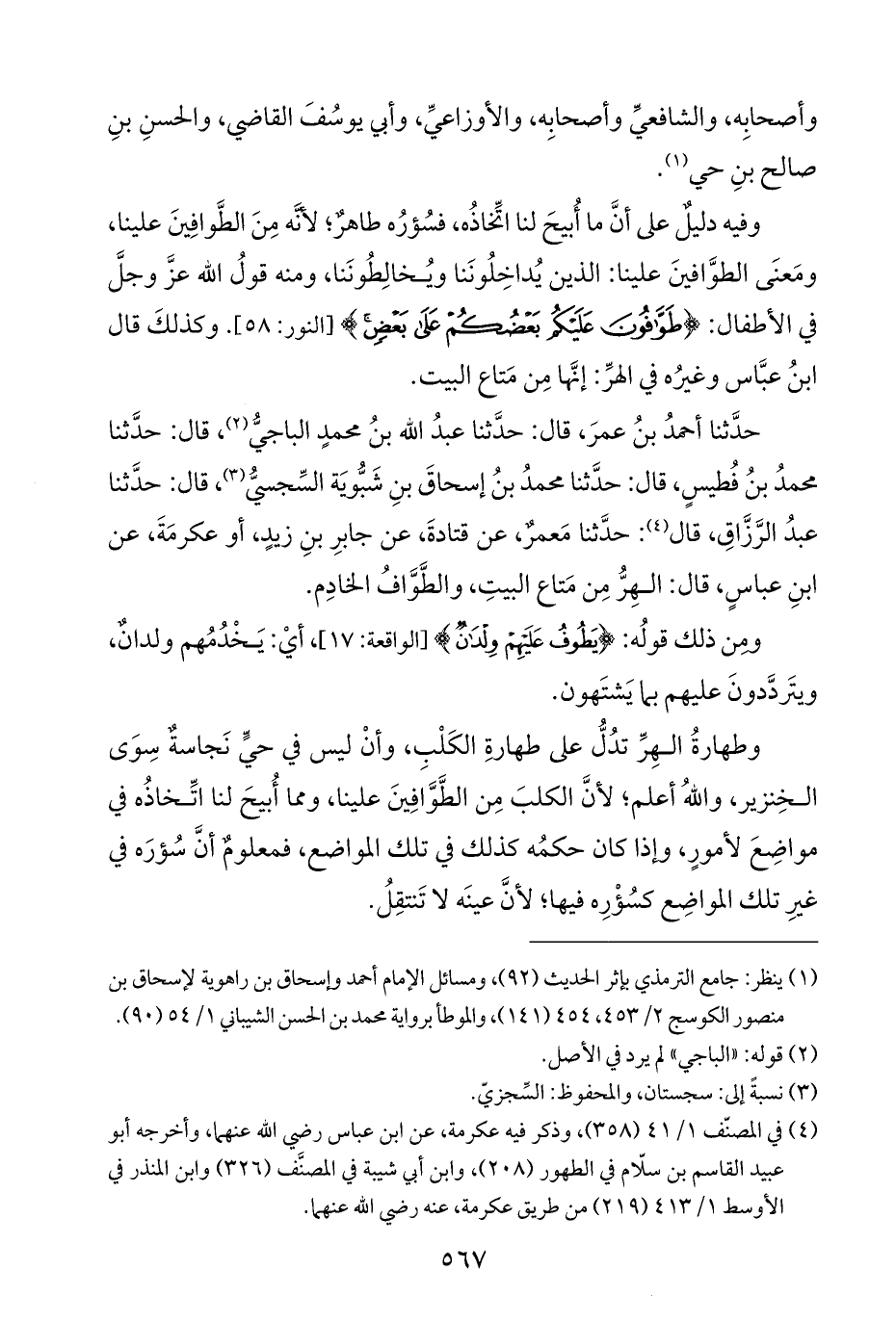 حدَّثنا أحمدُ بنُ عمرَ، قال: حدَّثنا عبدُ اللَّه بنُ محمدٍ الباجيُّ (¬٢)، قال: حدَّثنا محمدُ بنُ فُطيسٍ، قال: حدَّثنا محمدُ بنُ إسحاقَ بنِ شَبُّويَة السِّجسيُّ (¬٣)، قال: حدَّثنا عبدُ الرَّزَّاقِ، قال (¬٤): حدَّثنا مَعمرٌ، عن قتادةَ، عن جابرِ بنِ زيدٍ، أو عكرمَةَ، عن ابنِ عباسٍ، قال: الهِرُّ مِن مَتاع البيتِ، والطَّوَّافُ الخادِم.