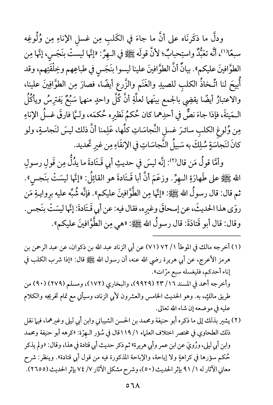 (¬٢) يشير بذلك إلى ما ذكره أبو حنيفة ومحمد بن الحسن الشيباني وابن أبي ليلى وغيرهما، فيما نقل ذلك الطحاوي في مختصر اختلاف العلماء ١/ ١١٩ قال في سُؤر الهِرّة: "كرهه أبو حنيفة ومحمد وابن أبي ليلى، ورُويَ عن ابن عمر وأبي هريرة" ثم ذكر حديث أبي قتادة في هذا، وقال: "ولم يذكر حُكم سؤرها في كراهةٍ ولا إباحة، والإباحة المذكورة فيه من قول أبي قتادة". وينظر: شرح معاني الآثار له ١/ ٩١ بإثر الحديث (٥٠)، وشرح مشكل الآثار ٧/ ٧٤ بإثر الحديث (٢٦٥٥).