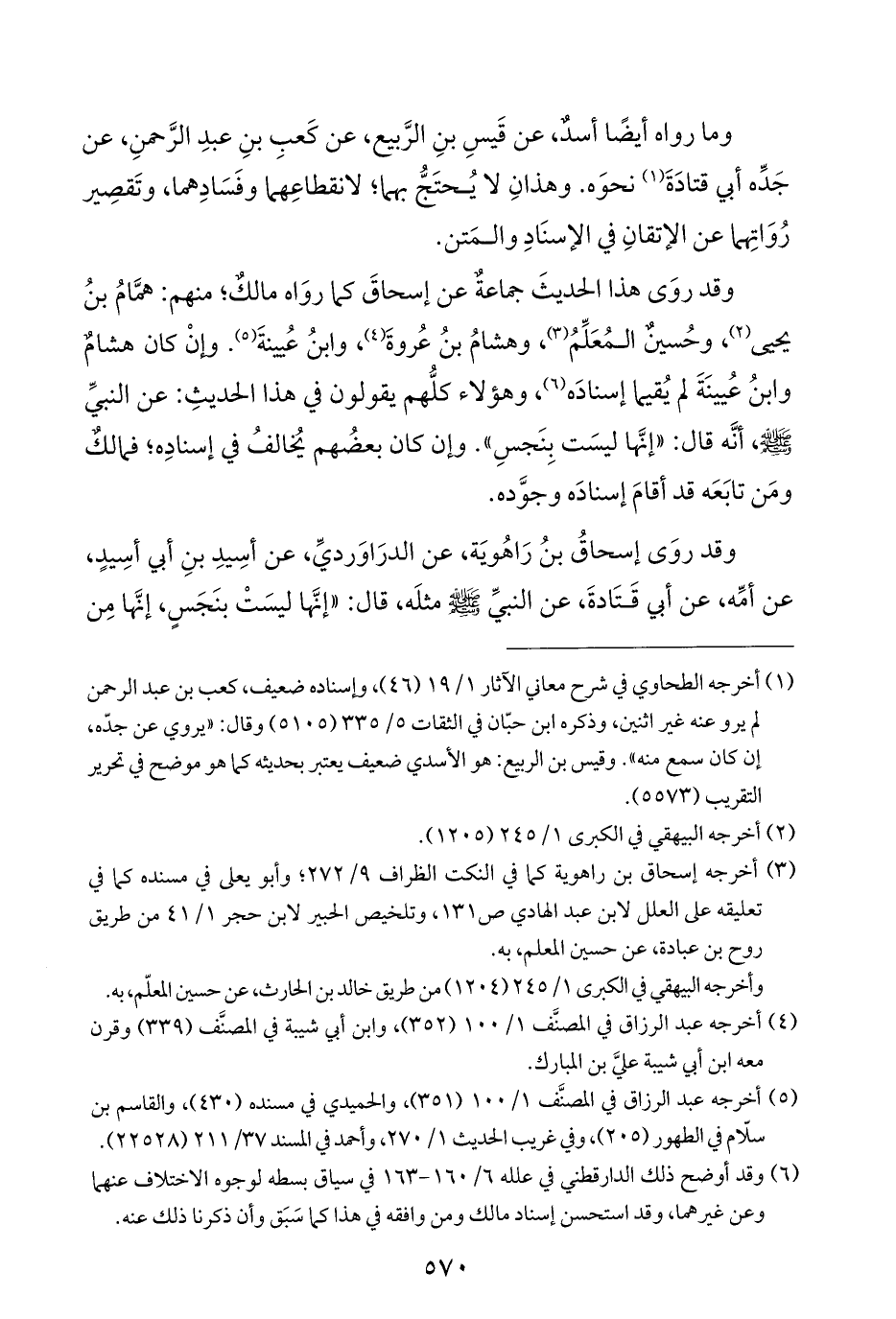 وقد روَى هذا الحديثَ جماعة عن إسحاقَ كما روَاه مالكٌ؛ منهم: همَّامُ بنُ يحيى (¬٢)، وحُسينٌ المُعَلِّمُ (¬٣)، وهشامُ بنُ عُروةَ (¬٤)، وابنُ عُيينةَ (¬٥). وإنْ كان هشامٌ وابنُ عُيينَةَ لم يُقيما إسنادَه (¬٦)، وهؤلاء كلُّهم يقولون في هذا الحديثِ: عن النبيِّ -صلى اللَّه عليه وسلم-، أنَّه قال: "إنَّها ليسَت بِنَجسِ". وإن كان بعضُهم يُخالفُ في إسنادِه؛ فمالكٌ ومَن تابَعَه قد أقامَ إسنادَه وجوَّده.