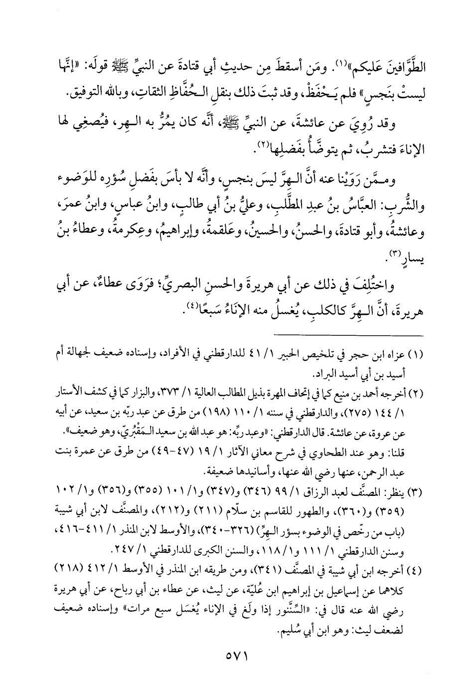 (¬٣) ينظر: المصنَّف لعبد الرزاق ١/ ٩٩ (٣٤٦) و (٣٤٧) و ١/ ١٠١ (٣٥٥) و (٣٥٦) و ١/ ١٠٢ (٣٥٩) و (٣٦٠)، والطهور للقاسم بن سلّام (٢١١) و (٢١٢)، والمصنَّف لابن أبي شيبة (باب من رخّص في الوضوء بسؤر الهِرِّ) (٣٢٦ - ٣٤٠)، والأوسط لابن المنذر ١/ ٤١١ - ٤١٦، وسنن الدارقطني ١/ ١١١ و ١/ ١١٨، والسنن الكبرى للدارقطني ١/ ٢٤٧.