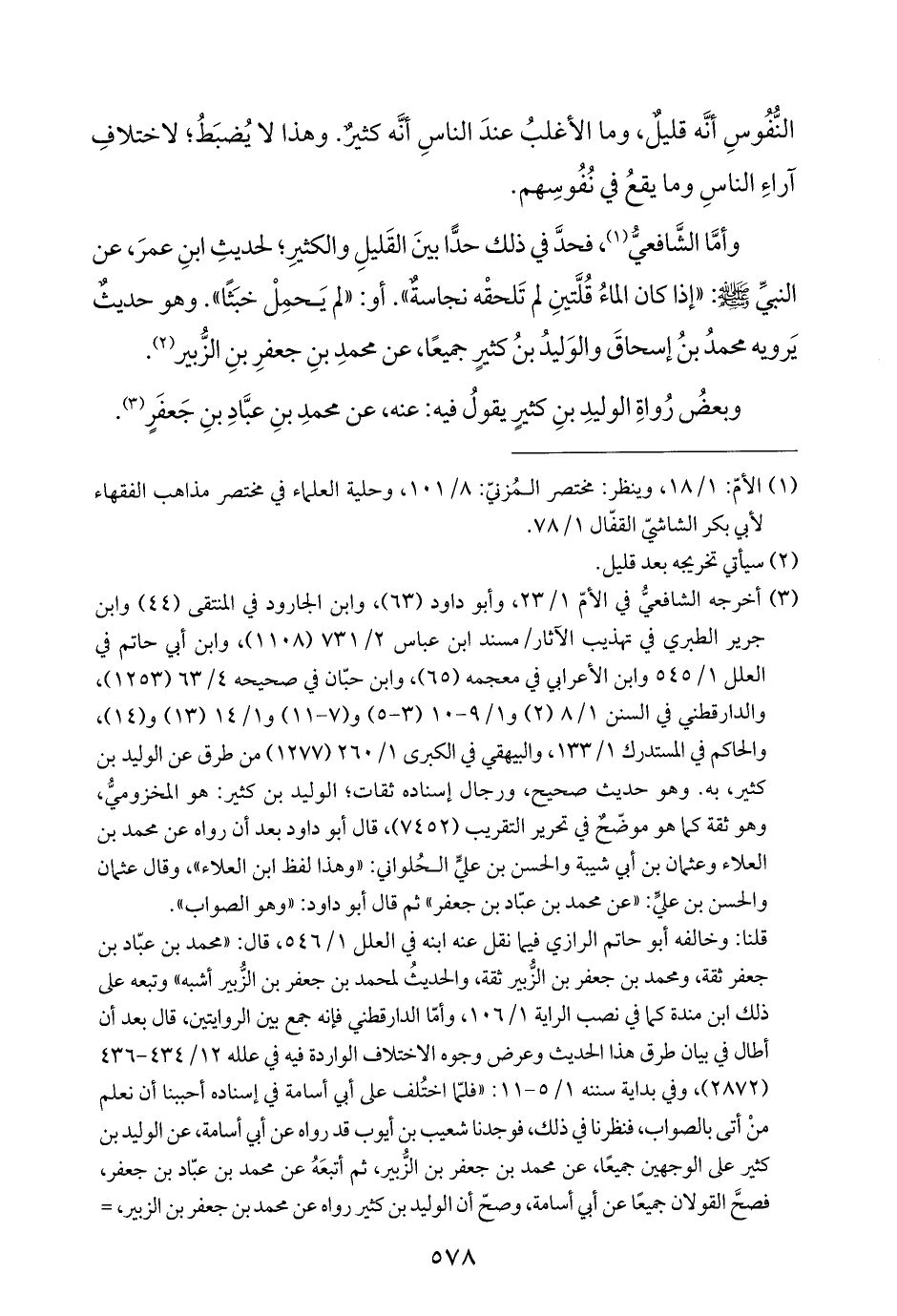وأمَّا الشَّافعيُّ (¬١)، فحدَّ في ذلك حدًّا بينَ القَليلِ والكثيرِ؛ لحديثِ ابنِ عمرَ، عن النبيِّ -صلى اللَّه عليه وسلم-: "إذا كان الماءُ قُلَّتينِ لم تَلحقْه نجاسةٌ". أو: "لم يَحمِلْ خبَثًا". وهو حديثٌ يَرويه محمدُ بنُ إسحاقَ والوَليدُ بنُ كثيرٍ جميعًا، عن محمدِ بنِ جعفرِ بنِ الزُّبير (¬٢).