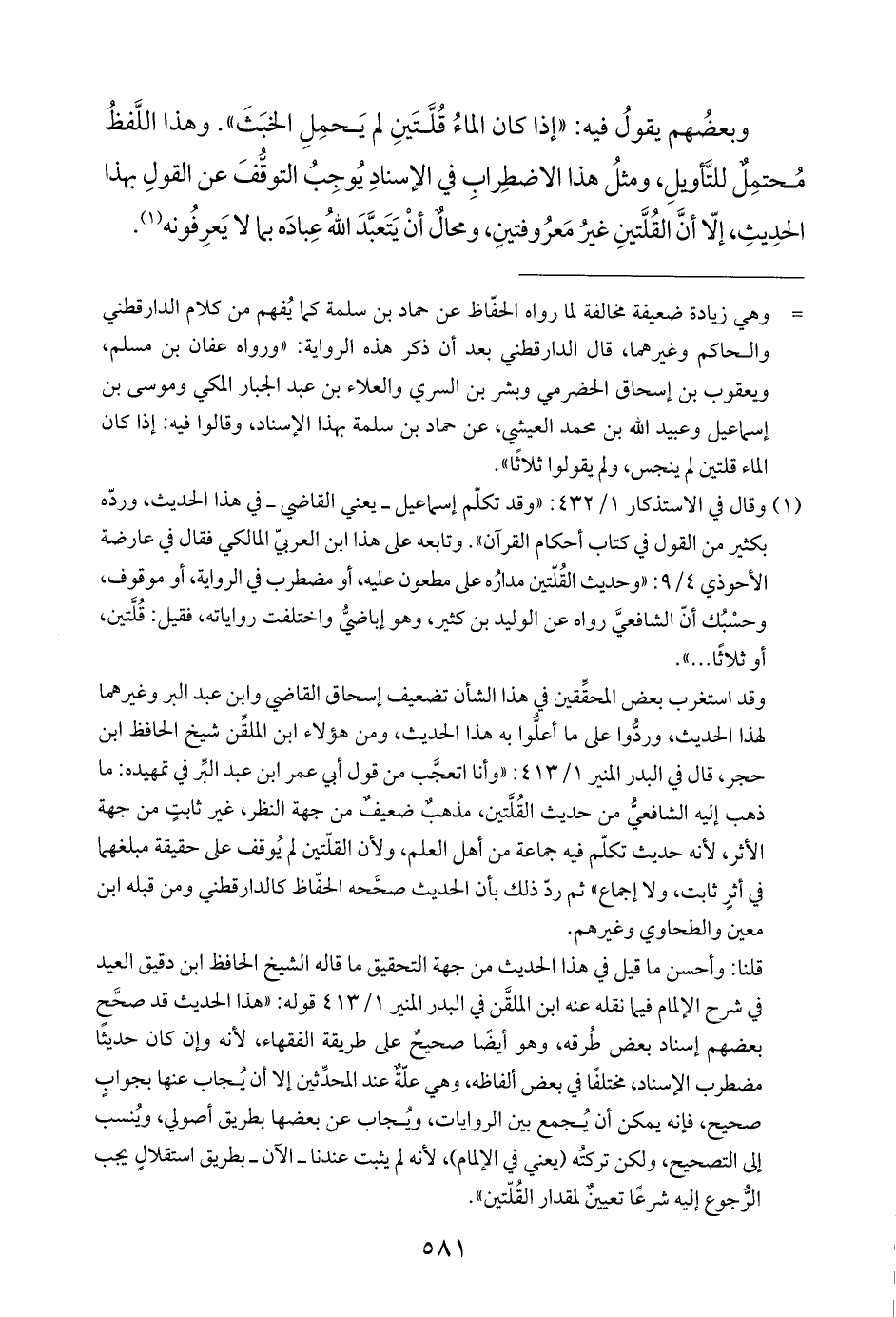 وقد استغرب بعض المحقِّقين في هذا الشأن تضعيف إسحاق القاضي وابن عبد البر وغيرهما لهذا الحديث، وردُّوا على ما أعلُّوا به هذا الحديث، ومن هؤلاء ابن الملقِّن شيخ الحافظ ابن حجر، قال في البدر المنير ١/ ٤١٣: "وأنا اتعجَّب من قول أبي عمر ابن عبد البر في تمهيده: ما ذهب إليه الشافعيُّ من حديث القُلَّتين، مذهبٌ ضعيفٌ من جهة النظر، غير ثابتٍ من جهة الأثر، لأنه حديث تكلّم فيه جماعة من أهل العلم، ولأن القلّتين لم يُوقف على حقيقة مبلغهما في أثرٍ ثابت، ولا إجماع" ثم ردّ ذلك بأن الحديث صحَّحه الحفّاظ كالدارقطني ومن قبله ابن معين والطحاوي وغيرهم.