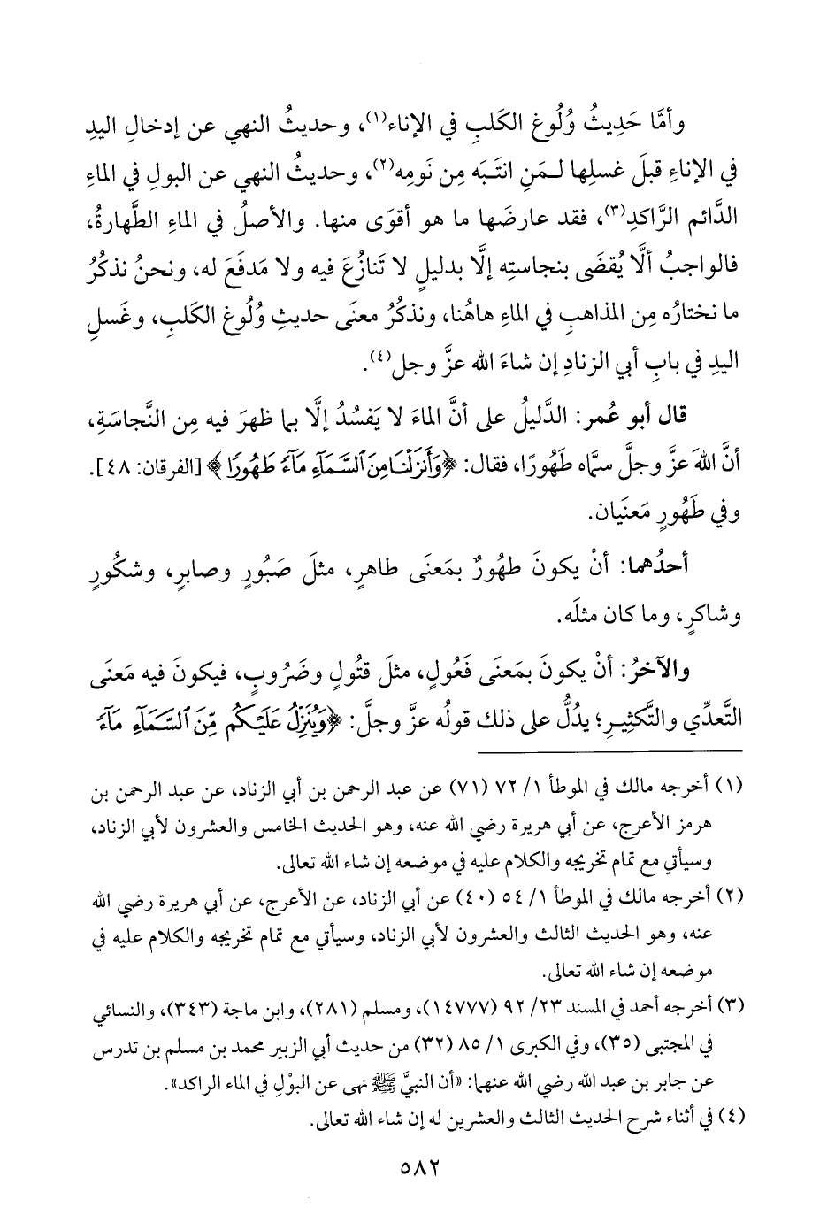 قال أبو عُمر: الدَّليلُ على أنَّ الماءَ لا يَفسُدُ إلَّا بما ظهرَ فيه مِن النَّجاسَةِ، أنَّ اللَّهَ عزَّ وجلَّ سمَّاه طَهُورًا، فقال: {وَأَنْزَلْنَا مِنَ السَّمَاءِ مَاءً طَهُورًا} [الفرقان: ٤٨]. وفي طَهُورٍ مَعنَيان.