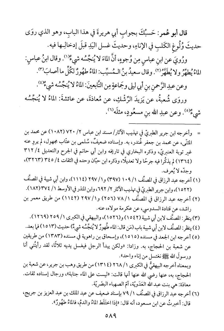 (¬٤) ينظر: المصنَّف لابن أبي شيبة باب (مَن قال: الماء طُهورٌ لا يُنجِّسُه شيءٌ) حديث (١٥١٣) فما بعد.