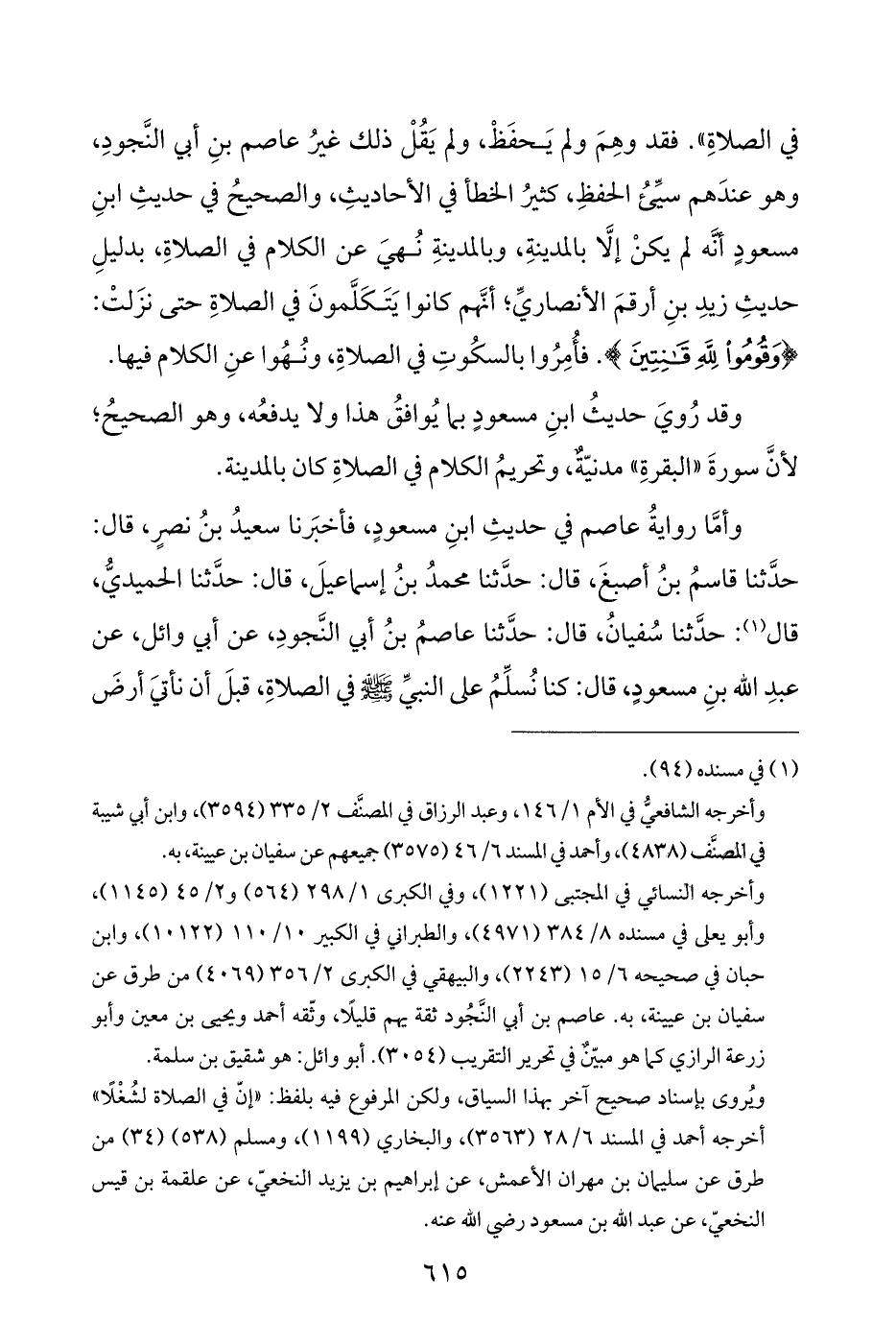 في الصلاةِ". فقد وهِمَ ولم يَحفَظْ، ولم يَقُلْ ذلك غيرُ عاصم بنِ أبي النَّجودِ، وهو عندَهم سيِّئُ الحفظِ، كثيرُ الخطأ في الأحاديثِ، والصحيحُ في حديثِ ابنِ مسعودٍ أنَّه لم يكنْ إلَّا بالمدينةِ، وبالمدينةِ نُهيَ عن الكلام في الصلاةِ، بدليلِ حديثِ زيدِ بنِ أرقمَ الأنصاريِّ؛ أنَّهم كانوا يَتَكَلَّمونَ في الصلاةِ حتى نزَلتْ: {وَقُومُوا لِلَّهِ قَانِتِينَ}. فأُمِرُوا بالسكُوتِ في الصلاةِ، ونُهُوا عنِ الكلام فيها.
