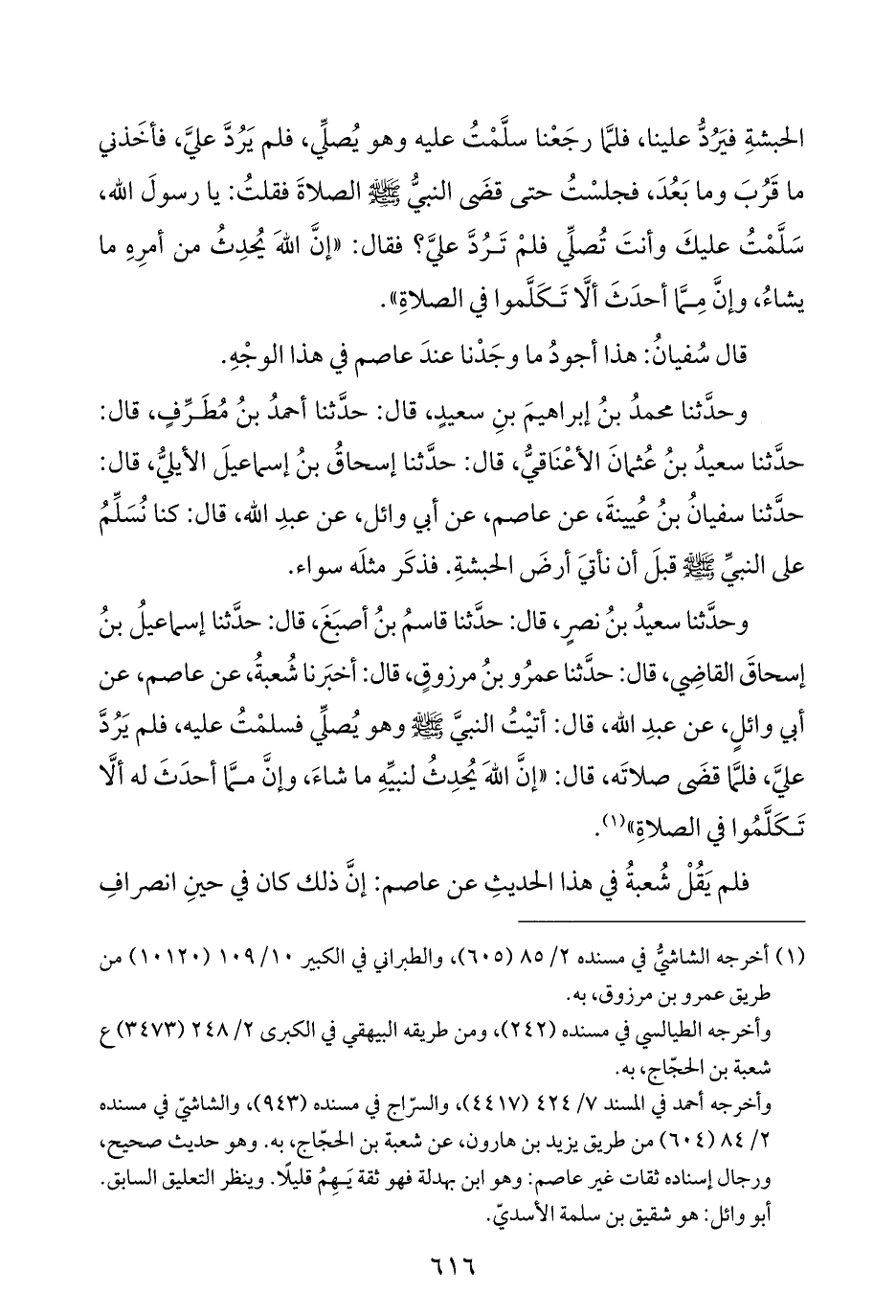 وحدَّثنا سعيدُ بنُ نصرٍ، قال: حدَّثنا قاسمُ بنُ أصبَغَ، قال: حدَّثنا إسماعيلُ بنُ إسحاقَ القاضِي، قال: حدَّثنا عمرُو بنُ مرزوقٍ، قال: أخبَرنا شُعبةُ، عن عاصم، عن أبي وائلٍ، عن عبدِ اللَّه، قال: أتيْتُ النبيَّ -صلى اللَّه عليه وسلم- وهو يُصلِّي فسلمْتُ عليه، فلم يَرُدَّ عليَّ، فلمَّا قضَى صلاتَه، قال: "إنَّ اللَّهَ يُحدِثُ لنبيِّهِ ما شاءَ، وإنَّ ممَّا أحدَثَ له ألَّا تَكَلَّمُوا في الصلاةِ" (¬١).