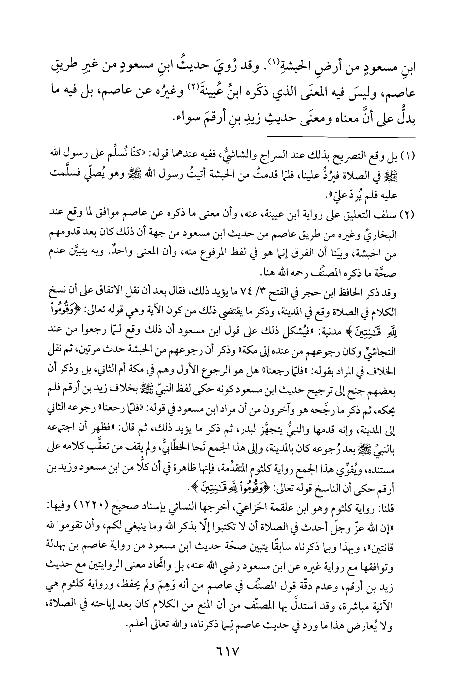 وقد ذكر الحافظ ابن حجر في الفتح ٣/ ٧٤ ما يؤيد ذلك، فقال بعد أن نقل الاتفاق على أن نسخ الكلام في الصلاة وقع في المدينة، وذكر ما يقتضي ذلك من كون الآية وهي قوله تعالى: {وَقُومُوا لِلَّهِ قَانِتِينَ} مدنية: "فيُشكل ذلك على قول ابن مسعود أن ذلك وقع لمّا رجعوا من عند النجاشيِّ وكان رجوعهم من عنده إلى مكة" وذكر أن رجوعهم من الحبشة حدث مرتين، ثم نقل الخلاف في المراد بقوله: "فلّما رجعنا" هل هو الرجوع الأول وهم في مكة أم الثاني، بل وذكر أن بعضهم جنح إلى ترجيح حديث ابن مسعود كونه حكى لفظ النبيّ -صلى اللَّه عليه وسلم- بخلاف زيد بن أرقم فلم يحكه، ثم ذكر ما رجَّحه هو وآخرون من أن مراد ابن مسعود في قوله: "فلّما رجعنا" رجوعه الثاني إلى المدينة، وإنه قدمها والنبيُّ يتجهَّز لبدر، ثم ذكر ما يؤيد ذلك، ثم قال: "فظهر أن اجتماعه بالنبيِّ -صلى اللَّه عليه وسلم- بعد رُجوعه كان بالمدينة، وإلى هذا الجمع نَحا الخطّابيُّ، ولم يقف من تعقَّب كلامه على مستنده، ويُقوِّي هذا الجمع رواية كلثوم المتقدِّمة، فإنها ظاهرة في أن كلًّا من ابن مسعود وزيد بن أرقم حكى أن الناسخ قوله تعالى: {وَقُومُوا لِلَّهِ قَانِتِينَ}.