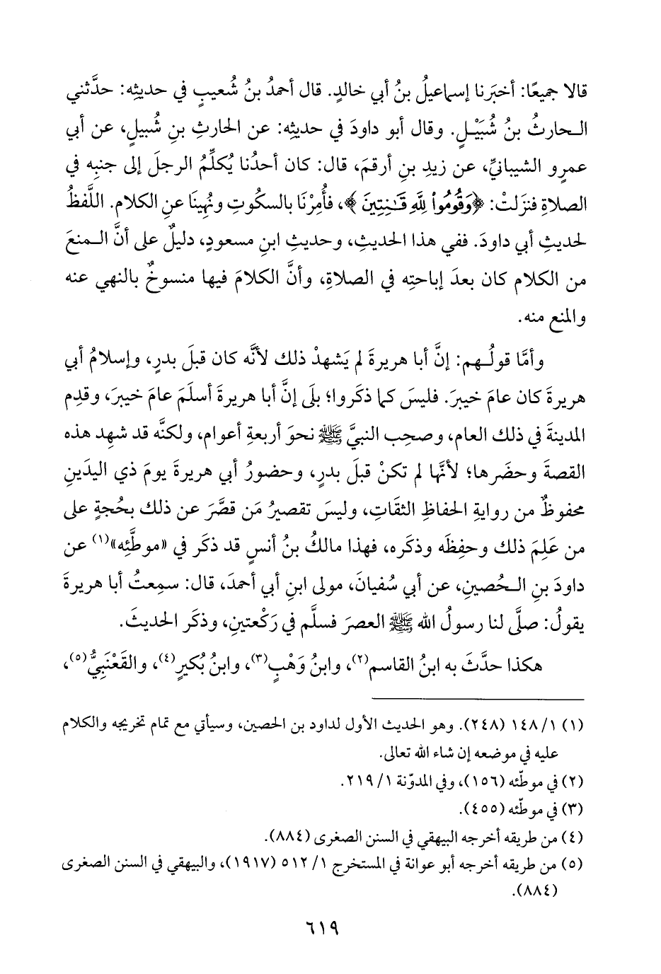 قالا جميعًا: أخبَرنا إسماعيلُ بنُ أبي خالدٍ. قال أحمدُ بنُ شُعيبٍ في حديثِه: حدَّثني الحارثُ بنُ شُبَيْلٍ. وقال أبو داودَ في حديثِه: عن الحارثِ بنِ شُبيلٍ، عن أبي عمرٍو الشيبانيِّ، عن زيدِ بنِ أرقمَ، قال: كان أحدُنا يُكلِّمُ الرجلَ إلى جنبِه في الصلاةِ فنزَلتْ: {وَقُومُوا لِلَّهِ قَانِتِينَ}، فأُمِرْنَا بالسكُوتِ ونُهِينَا عنِ الكلام. اللَّفظُ لحديثِ أبي داودَ. ففي هذا الحديثِ، وحديثِ ابنِ مسعودٍ، دليلٌ على أنَّ المنعَ من الكلام كان بعدَ إباحتِه في الصلاةِ، وأنَّ الكلامَ فيها منسوخٌ بالنهي عنه والمنع منه.