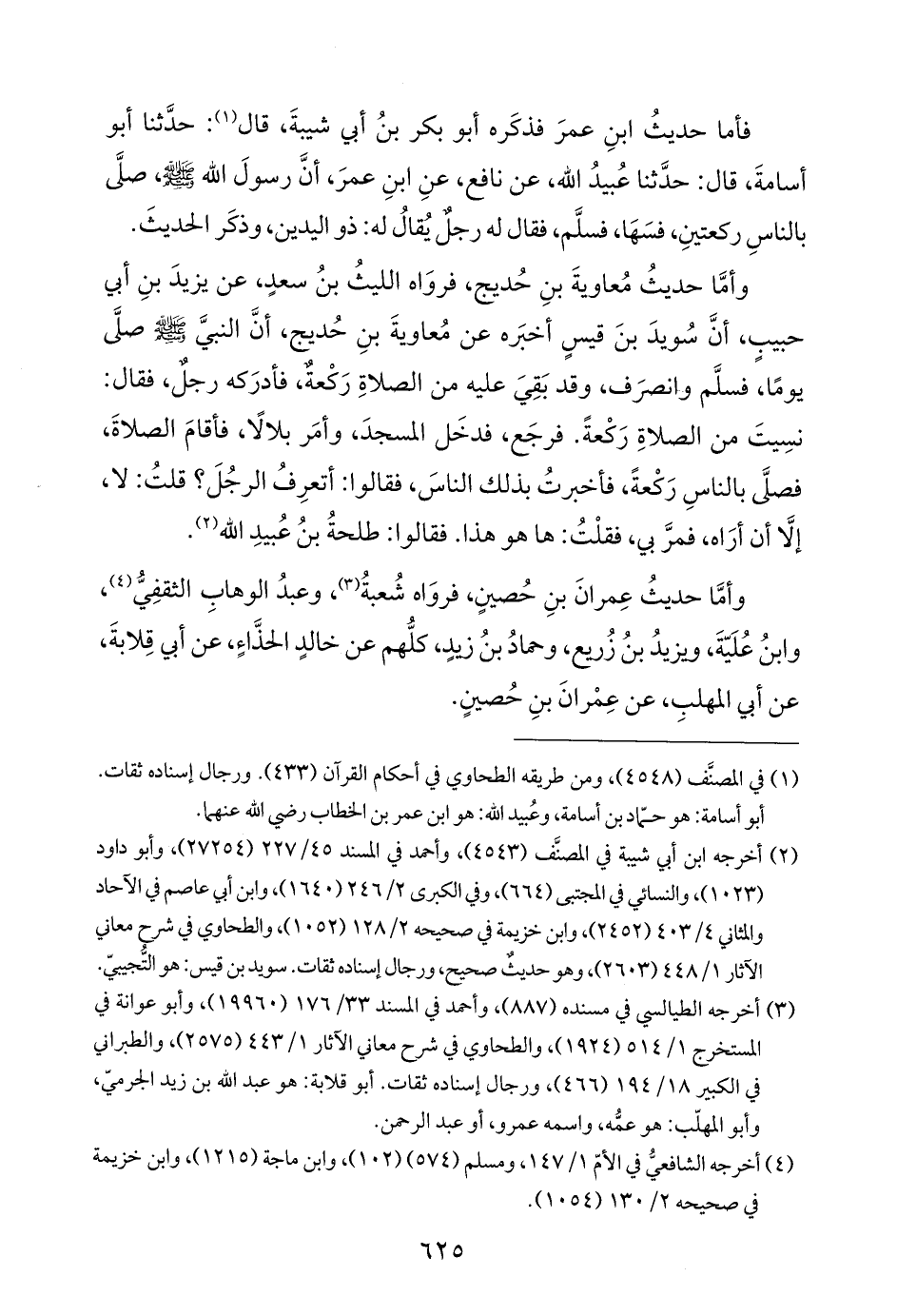 وأمَّا حديثُ مُعاويةَ بنِ حُديج، فروَاه الليثُ بنُ سعدٍ، عن يزيدَ بنِ أبي حبيبٍ، أنَّ سُويدَ بنَ قيسٍ أخبَره عن مُعاويةَ بنِ حُديج، أنَّ النبيَّ -صلى اللَّه عليه وسلم- صلَّى يومًا، فسلَّم وانصرَف، وقد بَقِيَ عليه من الصلاةِ رَكْعةٌ، فأدرَكه رجل، فقال: نسِيتَ من الصلاةِ رَكْعةً. فرجَع، فدخَل المسجدَ، وأمَر بلالًا، فأقامَ الصلاةَ، فصلَّى بالناسِ رَكْعةً، فأخبرتُ بذلك الناسَ، فقالوا: أتعرِفُ الرجُلَ؟ قلتُ: لا، إلَّا أن أرَاه، فمرَّ بي، فقلْتُ: ها هو هذا. فقالوا: طلحةُ بنُ عُبيدِ اللَّه (¬٢).