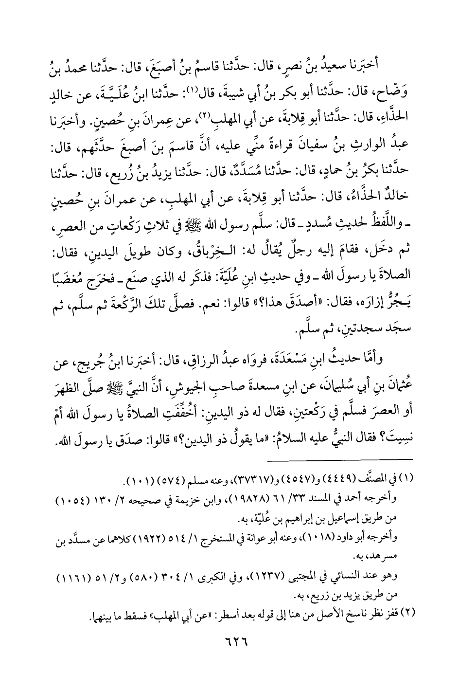 أخبَرنا سعيدُ بنُ نصرٍ، قال: حدَّثنا قاسمُ بنُ أصبَغَ، قال: حدَّثنا محمدُ بنُ وَضّاح، قال: حدَّثنا أبو بكر بنُ أبي شيبةَ، قال (¬١): حدَّثنا ابنُ عُلَيَّةَ، عن خالدٍ الحذَّاءِ، قال: حدَّثنا أبو قِلابةَ، عن أبي المهلبِ (¬٢)، عن عِمرانَ بنِ حُصينٍ. وأخبَرنا عبدُ الوارثِ بنُ سفيانَ قراءةً منِّي عليه، أنَّ قاسمَ بنَ أصبغَ حدَّثَهم، قال: حدَّثنا بكرُ بنُ حمادٍ، قال: حدَّثنا مُسَدَّدٌ، قال: حدَّثنا يزيدُ بنُ زُريع، قال: حدَّثنا خالدٌ الحذَّاءُ، قال: حدَّثنا أبو قِلابةَ، عن أبي المهلبِ، عن عمرانَ بنِ حُصينٍ -واللَّفظُ لحديثِ مُسددٍ- قال: سلم رسول اللَّه -صلى اللَّه عليه وسلم- في ثلاثِ رَكْعاتٍ من العصرِ، ثم دخَل، فقامَ إليه رجل يُقالُ له: الخِرْباقُ، وكان طويلَ اليدينِ، فقال: الصلاةَ يا رسولَ اللَّه -وفي حديثِ ابنِ عُلمةَ: فذكَر له الذي صنَع- فخرَج مُغضَبًا يَجُرُّ إزارَه، فقال: "أصدَقَ هذا؟ " قالوا: نعم. فصلَّى تلكَ الرَّكْعةَ ثم سلَّم، ثم سجَد سجدتينِ، ثم سلَّم.