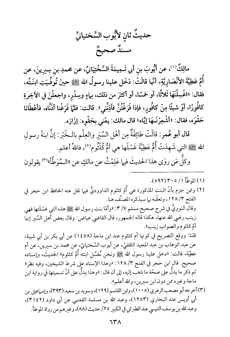 مالِكٌ (¬١)، عن أيُّوبَ بنِ أبي تَمِيمَةَ السَّخْتِيَانيِّ، عن محمدِ بنِ سِيرِينَ، عن أُمِّ عَطِيَّةَ الأنْصَارِيَّةِ، أنَّها قالَتْ: دَخَل علينا رسولُ اللَّه -صلى اللَّه عليه وسلم- حينَ تُوفِّيَتِ ابنَتُه، فقال: "اغْسِلْنَهَا ثَلاثًا، أو خمسًا، أو أكثرَ من ذلك، بماءٍ وسِدْرٍ، واجعلْنَ في الآخِرةِ كافُورًا، أوْ شيئًا مِنْ كافُورٍ، فإذا فَرَغْتُنَّ فآذِنَّني". قالت: فلمَّا فَرَغْنا آذَنَّاه، فأعْطَانا حَقْوَه، فقال: "أشْعِرْنَهَا إيَّاه" قال مالك: يعْني بحَقْوِه: إزَارَه.