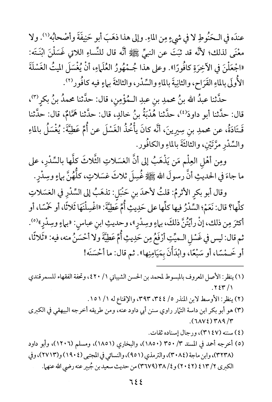 حدَّثنا عبدُ اللَّه بنُ محمدِ بنِ عبدِ المُؤْمِنِ، قال: حدَّثنا محمدُ بنُ بكرٍ (¬٣)، قال: حدَّثنا أبو داودَ (¬٤)، حدَّثنا هُدْبَةُ بنُ خالدٍ، قال: حدَّثنا هَمَّامٌ، قال: حدَّثنا قَتَادَةُ، عن محمدِ بنِ سِيرِينَ، أنَّه كانَ يأْخُذُ الغَسْلَ عن أُمِّ عَطِيَّةَ: يُغْسَلُ بالماءِ والسِّدْرِ مرَّتَيْنِ، والثالثَةَ بالماءِ والكافُور.
