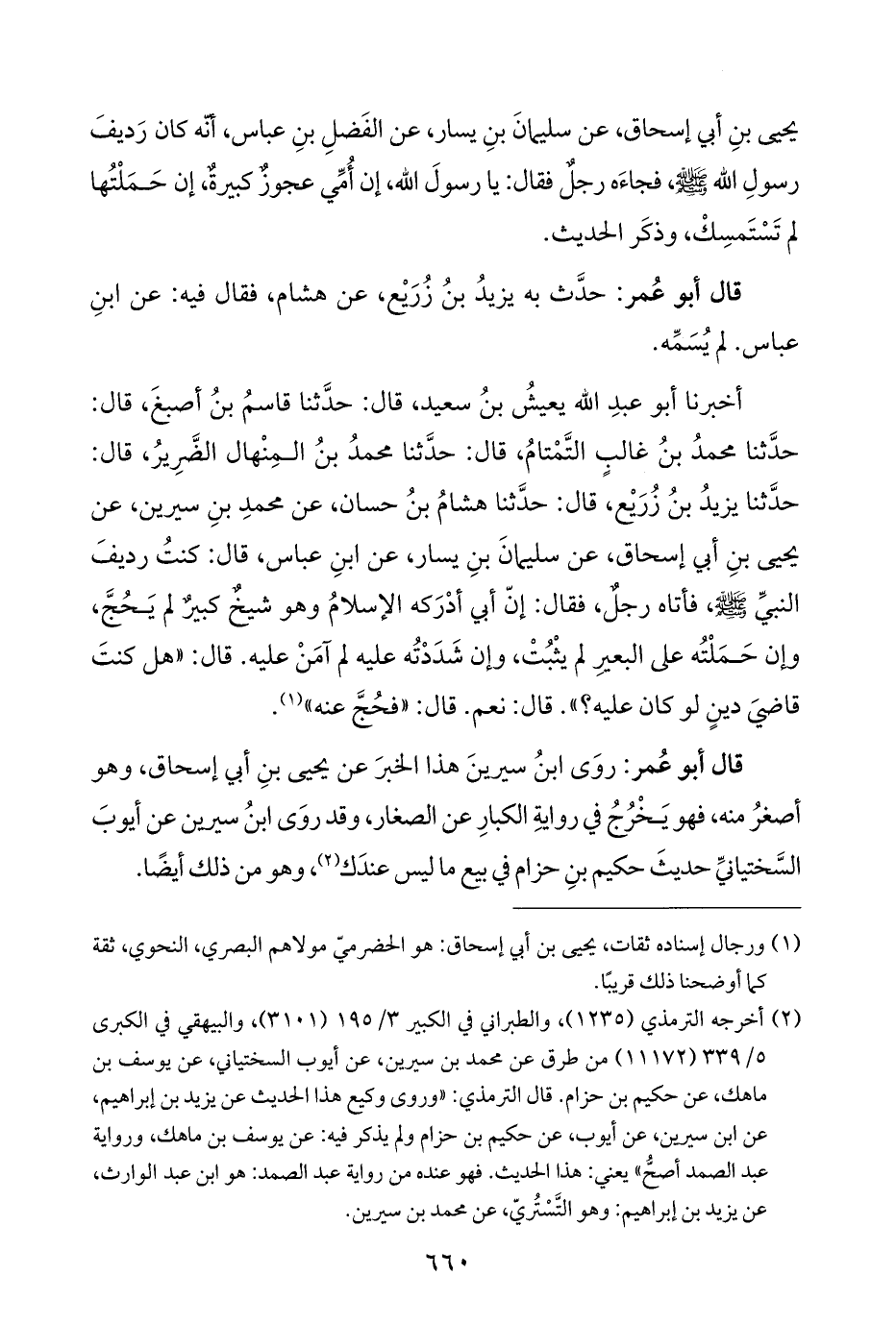 يحيى بنِ أبي إسحاق، عن سليمانَ بنِ يسار، عن الفَضلِ بنِ عباس، أنّه كان رَديفَ رسولِ اللَّه -صلى اللَّه عليه وسلم-، فجاءَه رجلٌ فقال: يا رسولَ اللَّه، إن أُمِّي عجوزٌ كبيرةٌ إن حَمَلْتُها لم تَسْتَمسِكْ، وذكَر الحديث.