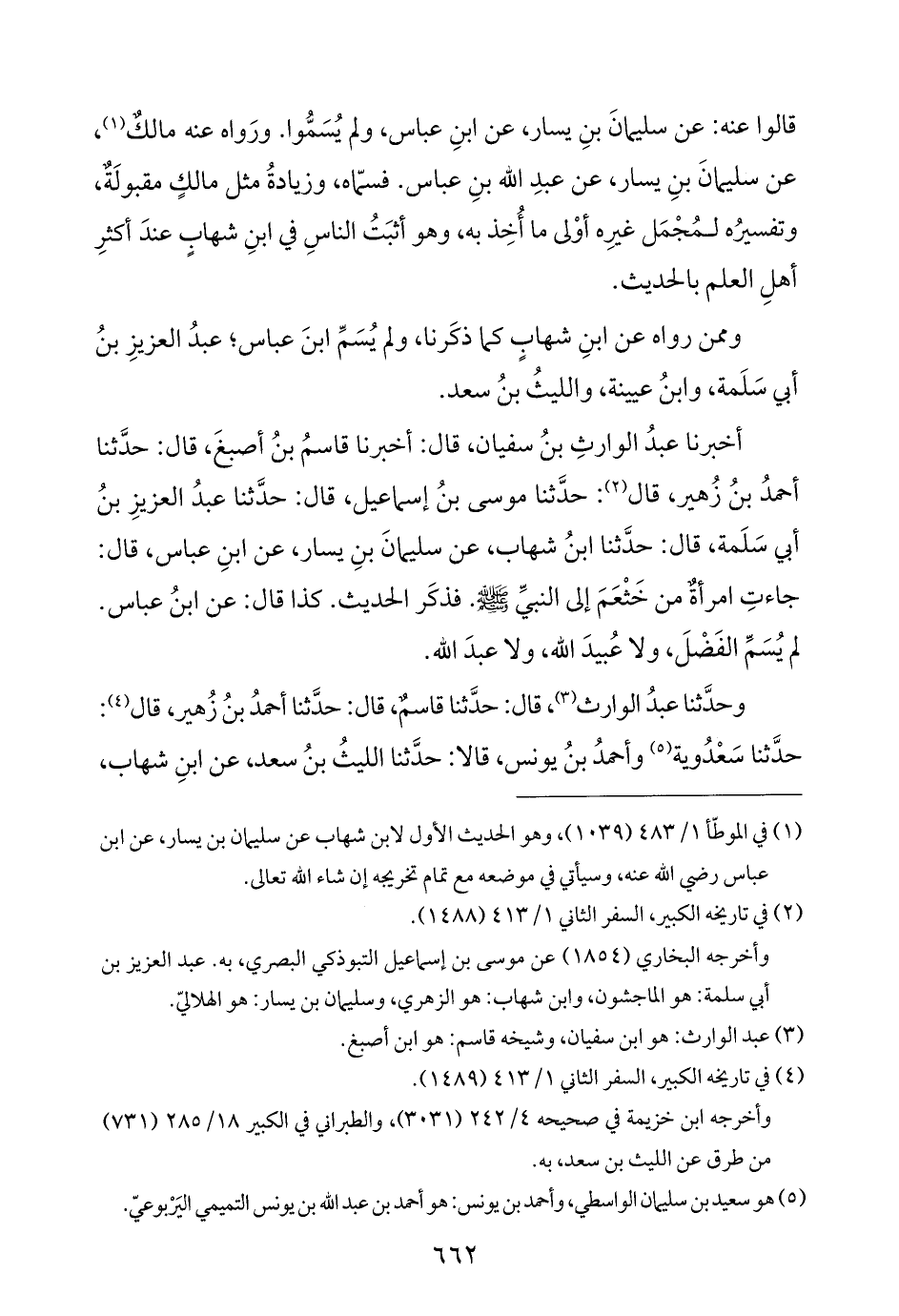 قالوا عنه: عن سليمانَ بنِ يسار، عن ابنِ عباس، ولم يُسَمُّوا. ورَواه عنه مالكٌ (¬١)، عن سليمانَ بنِ يسار، عن عبدِ اللَّه بنِ عباس. فسمّاه، وزيادةُ مثل مالكٍ مقبولَةٌ، وتفسيرُه لمُجْمَل غيرِه أوْلى ما أُخِذ به، وهو أثبَتُ الناسِ في ابنِ شهابٍ عندَ أكثرِ أهلِ العلم بالحديث.