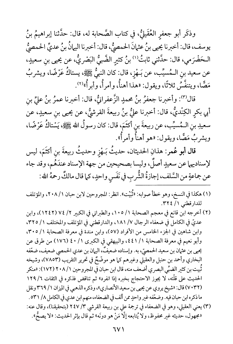 وذكَر أبو جعفرٍ العُقَيليُّ، في كتاب الصَّحابة له، قال: حدَّثنا إبراهيمُ بنُ يوسف، قال: أخبرنا يحيى بنُ عثمانَ الحمصيُّ، قال: أخبرنا اليمانُ بنُ عديِّ الحمصيُّ الحَضْرَمي، قال: حدَّثني ثابتُ (¬١) بنُ كثيرٍ الضَّبيُّ البَصْريُّ، عن يحيى بنِ سعيدٍ، عن سعيد بنِ المُسيِّب، عن بَهْزٍ، قال: كان النبيُّ -صلى اللَّه عليه وسلم-، يستاكُ عَرْضًا، ويشربُ مَصًّا، ويتنفَّسُ ثلاثًا، ويقول: "هذا أهنأُ، وأمرأُ، وأبرأُ" (¬٢).
