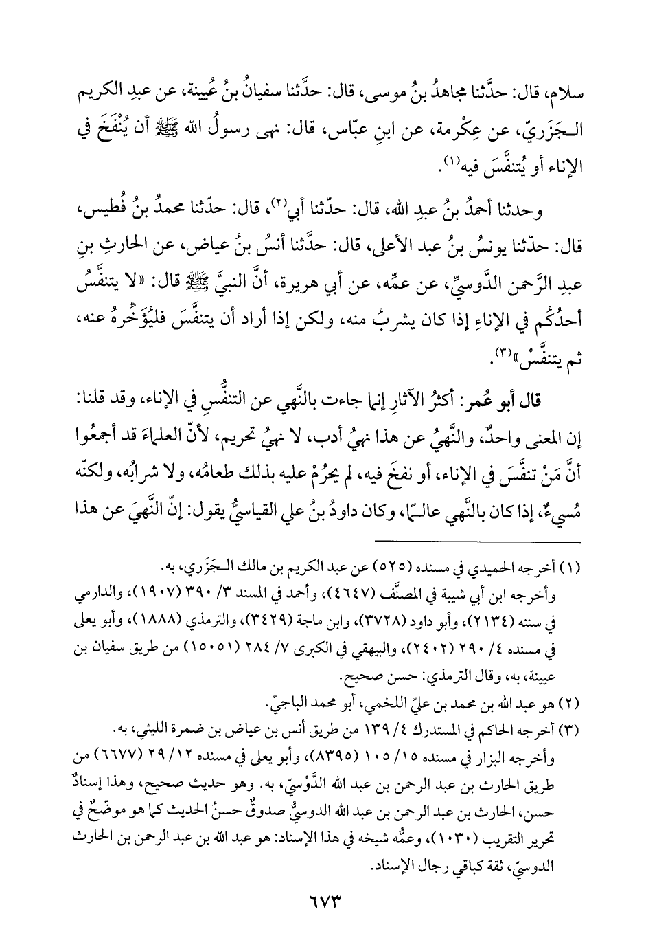 قال أبو عُمر: أكثرُ الآثارِ إنما جاءت بالنَّهي عن التنفُّسِ في الإناء، وقد قلنا: إن المعنى واحدٌ، والنَّهيُ عن هذا نهيُ أدب، لا نهيُ تحريم، لأنّ العلماءَ قد أجمعُوا أنَّ مَنْ تنفَّسَ في الإناء، أو نفخَ فيه، لم يحرُمْ عليه بذلك طعامُه، ولا شرابُه، ولكنّه مُسيءٌ، إذا كان بالنَّهي عالمًا، وكان داودُ بنُ علي القياسيُّ يقول: إنّ النَّهيَ عن هذا