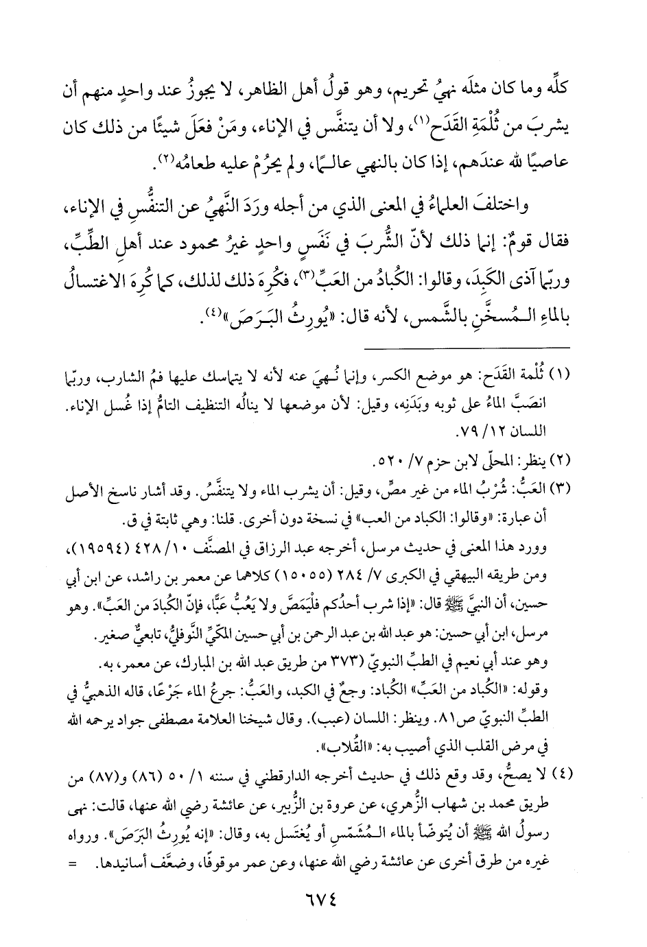 واختلفَ العلماءُ في المعنى الذي من أجله ورَدَ النَّهيُ عن التنفُّسِ في الإناء، فقال قومٌ: إنما ذلك لأنّ الشُّربَ في نَفَسٍ واحدٍ غيرُ محمود عند أهلِ الطِّبِّ، وربّما آذى الكَبِدَ، وقالوا: الكُبادُ من العَبِّ (¬٣)، فكُرِهَ ذلك لذلك، كما كُرِهَ الاغتسالُ بالماءِ المُسخَّنِ بالشَّمس، لأنه قال: "يُورِثُ البَرَصَ" (¬٤).