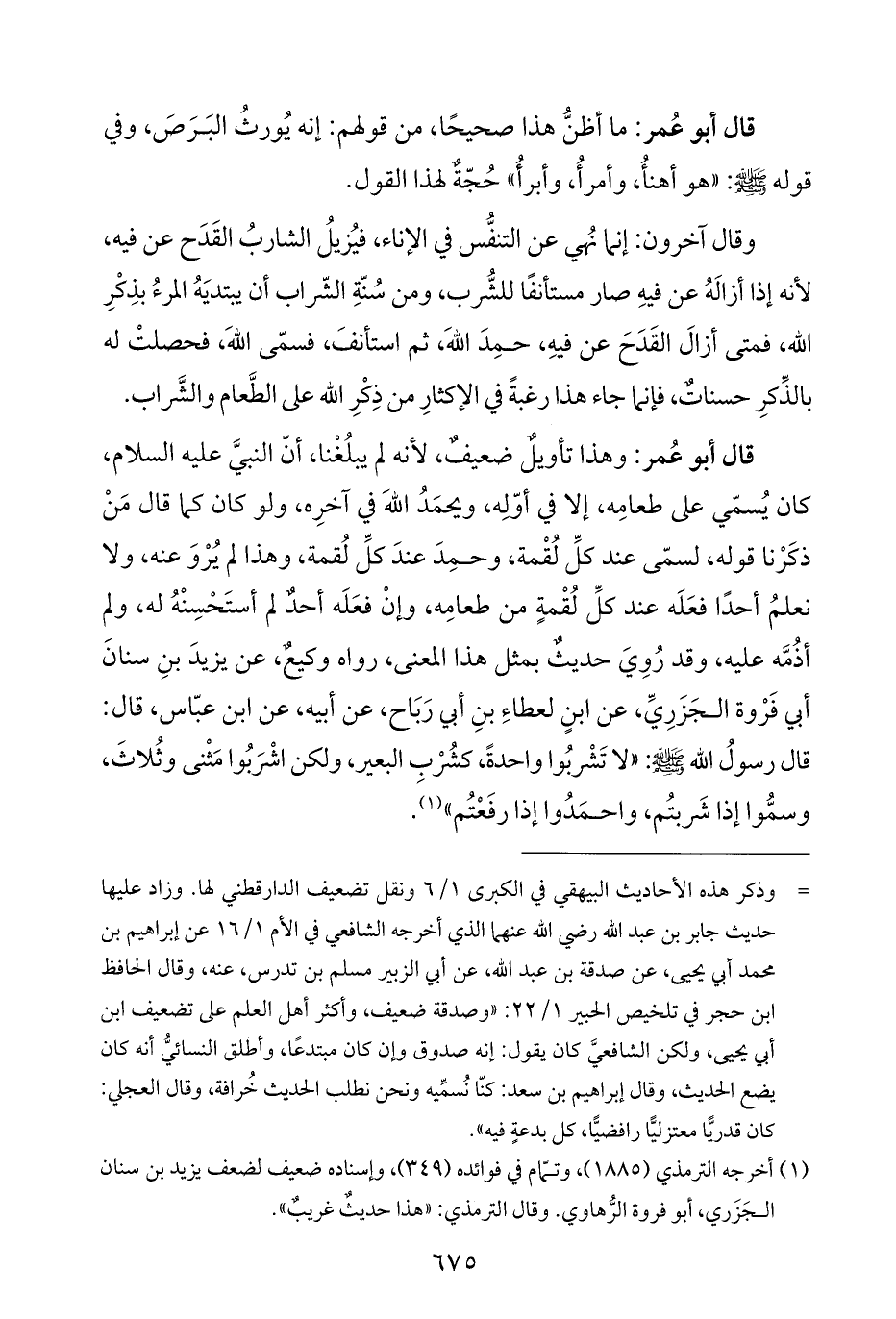 قال أبو عُمر: وهذا تأويلٌ ضعيفٌ، لأنه لم يبلُغْنا، أنّ النبيَّ عليه السلام، كان يُسمّي على طعامِه، إلا في أوّلِه، ويحمَدُ اللَّهَ في آخرِه، ولو كان كما قال مَنْ ذكَرْنا قوله، لسمّى عند كلِّ لُقْمة، وحمِدَ عندَ كلِّ لُقمة، وهذا لم يُرْوَ عنه، ولا نعلمُ أحدًا فعَلَه عند كلِّ لُقْمةٍ من طعامِه، وإنْ فعَلَه أحدٌ لم أستَحْسِنْهُ له، ولم أذُمَّه عليه، وقد رُوِيَ حديثٌ بمثل هذا المعنى، رواه وكيعٌ، عن يزيدَ بنِ سنانَ أبي فَرْوة الجَزَرِيِّ، عن ابنٍ لعطاءِ بنِ أبي رَبَاح، عن أبيه، عن ابن عبّاس، قال: قال رسولُ اللَّه -صلى اللَّه عليه وسلم-: "لا تَشْربُوا واحدةً، كشُرْبِ البعير، ولكن اشْرَبُوا مَثْنى وثُلاثَ، وسمُّوا إذا شَربتُم، واحمَدُوا إذا رفَعْتُم" (¬١).