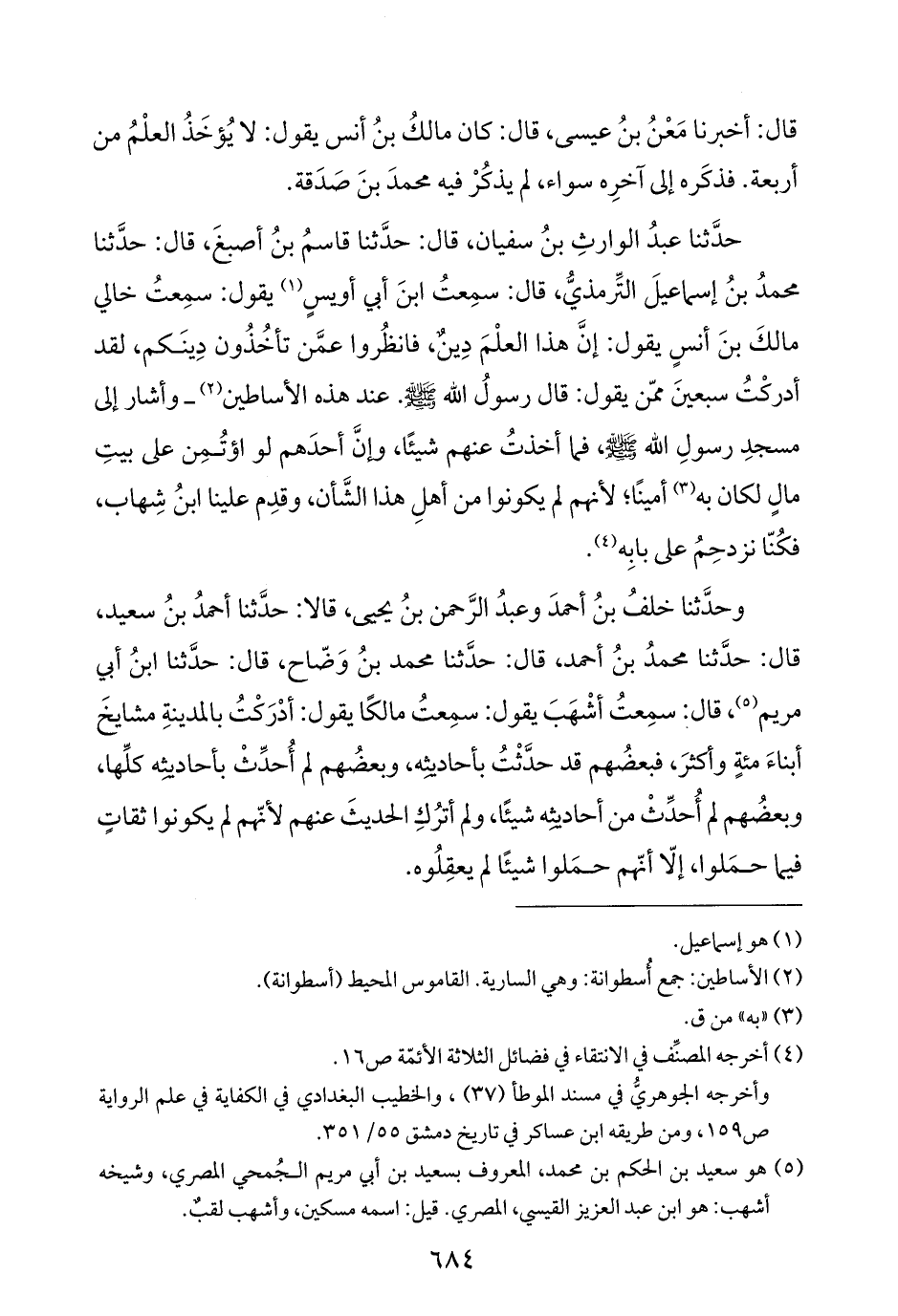 وحدَّثنا خلفُ بنُ أحمدَ وعبدُ الرَّحمن بنُ يحيى، قالا: حدَّثنا أحمدُ بنُ سعيد، قال: حدَّثنا محمدُ بنُ أحمد، قال: حدَّثنا محمد بنُ وَضّاح، قال: حدَّثنا ابنُ أبي مريم (¬٥)، قال سمِعتُ أشْهَبَ يقول: سمِعتُ مالكًا يقول: أدْرَكْتُ بالمدينةِ مشايخَ أبناءَ مئةٍ وأكثرَ، فبعضُهم قد حدَّثْتُ بأحاديثه، وبعضُهم لم أُحدِّثْ بأحاديثِه كلِّها، وبعضُهم لم أُحدِّثْ من أحاديثِه شيئًا، ولم أترُكِ الحديثَ عنهم لأنّهم لم يكونوا ثقاتٍ فيما حمَلوا، إلَّا أنّهم حمَلوا شيئًا لم يعقِلُوه.