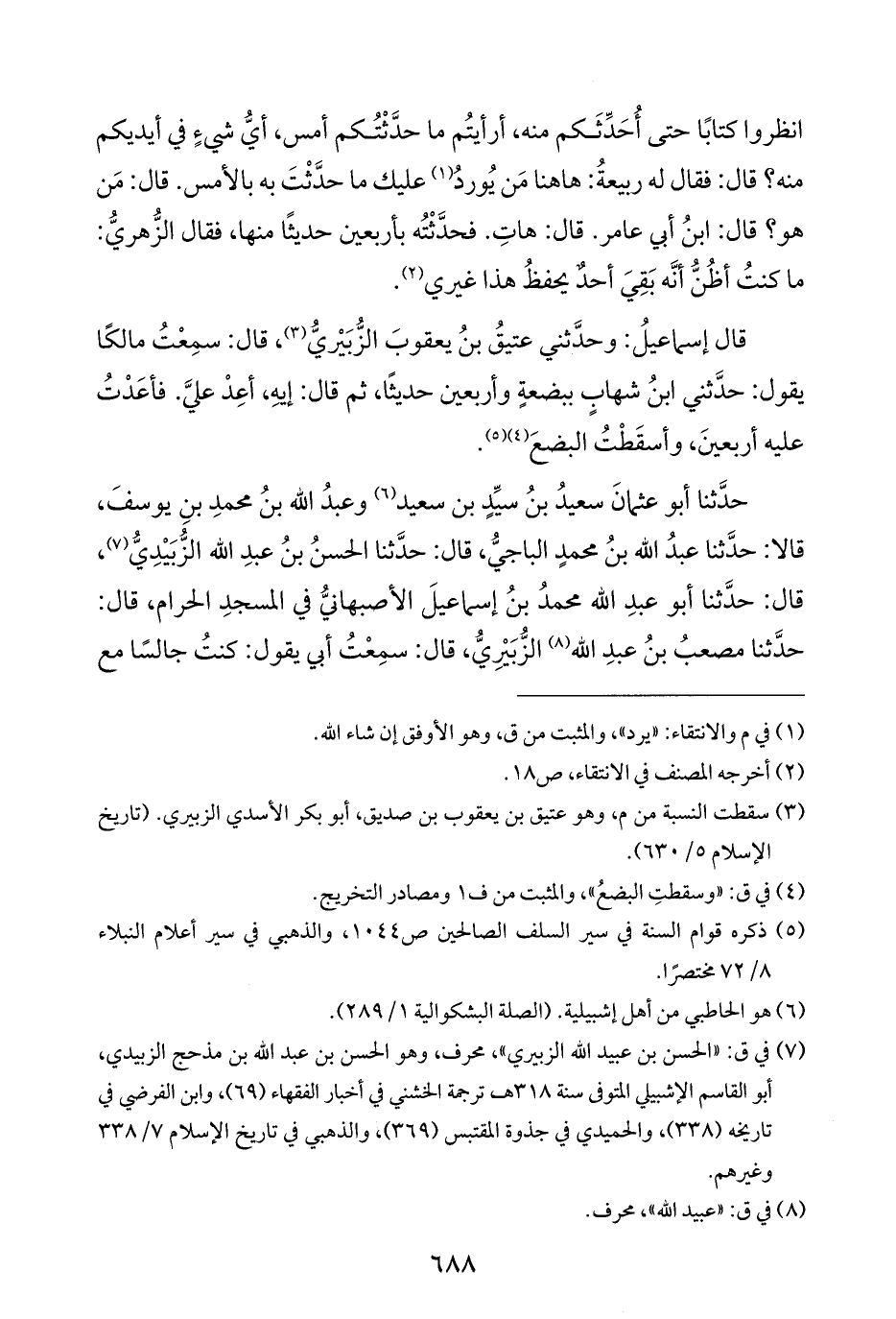 حدَّثنا أبو عثمانَ سعيدُ بنُ سيِّدٍ بن سعيد (¬٦) وعبدُ اللَّه بنُ محمدِ بنِ يوسفَ، قالا: حدَّثنا عبدُ اللَّه بنُ محمدٍ الباجيُّ، قال: حدَّثنا الحسنُ بنُ عبدِ اللَّه الزُّبَيْدِيُّ (¬٧)، قال: حدَّثنا أبو عبدِ اللَّه محمدُ بنُ إسماعيلَ الأصبهانيُّ في المسجدِ الحرام، قال: حدَّثنا مصعبُ بنُ عبدِ اللَّه (¬٨) الزُّبَيْرِيُّ، قال: سمِعْتُ أبي يقول: كنتُ جالسًا مع