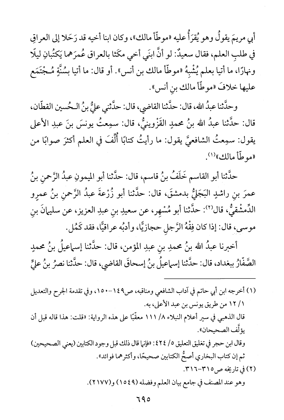 وحدَّثنا عبدُ اللَّه، قال: حدَّثنا القاضي، قال: حدَّثني عليُّ بنُ الحُسين القطّان، قال: حدَّثنا عبدُ اللَّه بنُ محمدٍ القَزْوينيُّ، قال: سمِعتُ يونسَ بنَ عبدِ الأعلى يقول: سمِعتُ الشافعيَّ يقول: ما رأيتُ كتابًا أُلِّفَ في العلم أكثرَ صوابًا من "موطّأ مالك" (¬١).