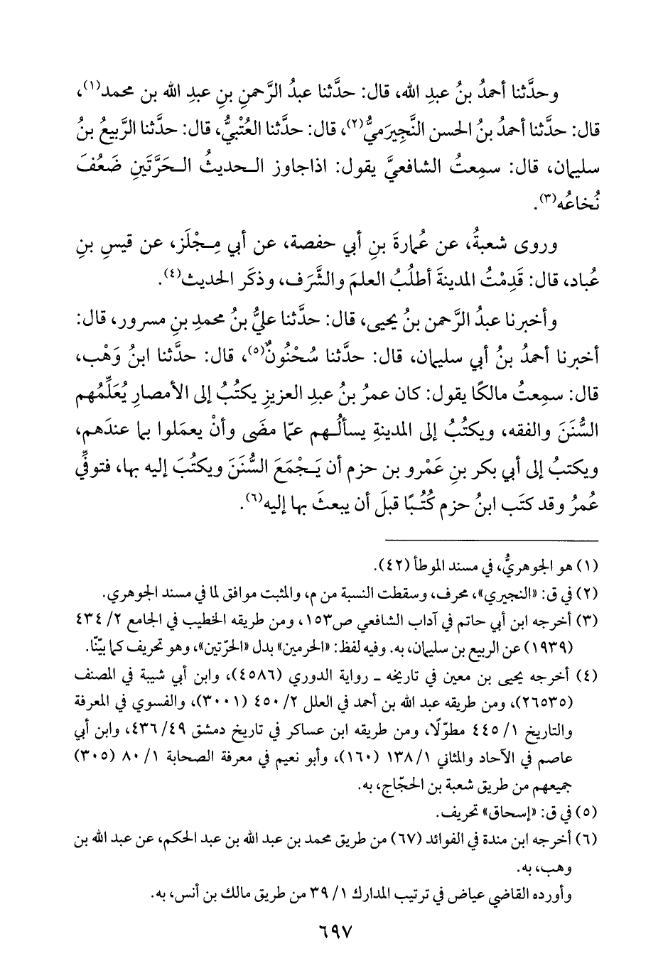 وأخبرنا عبدُ الرَّحمن بنُ يحيى، قال: حدَّثنا عليُّ بنُ محمدِ بنِ مسرور، قال: أخبرنا أحمدُ بنُ أبي سليمان، قال: حدَّثنا سُحْنُونٌ (¬٥)، قال: حدَّثنا ابنُ وَهْب، قال: سمِعتُ مالكًا يقول: كان عمرُ بنُ عبدِ العزيزِ يكتُبُ إلى الأمصارِ يُعَلِّمُهم السُّنَنَ والفقه، ويكتُبُ إلى المدينةِ يسألُهم عمّا مضَى وأنْ يعمَلوا بما عندَهم، ويكتبُ إلى أبي بكر بنِ عَمْرو بن حزم أن يَجْمَعَ السُّنَنَ ويكتُبَ إليه بها، فتوفِّي عُمرُ وقد كتَب ابنُ حزم كُتُبًا قبلَ أن يبعثَ بها إليه (¬٦).