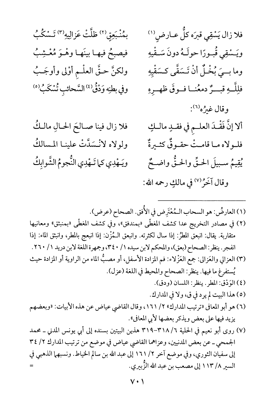 (¬٧) روى أبو نعيم في الحلية ٦/ ٣١٨ - ٣١٩ هذين البيتين بسنده إلى أبي يونس المدني - محمد الجمحي - عن بعض المدنيين، وعزاهما القاضي عياض في موضع من ترتيب المدارك ٢/ ٣٤ إلى سفيان الثوري، وفي موضع آخر ٢/ ١٦١ إلى عبد الله بن سالم الخياط. ونسبهما الذهبي في السير ٨/ ١١٣ إلى مصعب بن عبد الله الزُّبيري.