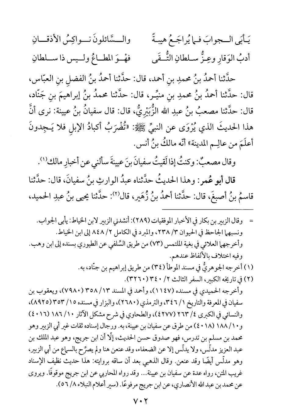 حدَّثنا أحمدُ بنُ محمدِ بنِ أحمد، قال: حدَّثنا أحمدُ بنُ الفضلِ بنِ العبّاس، قال: حدَّثنا أحمدُ بنُ محمدِ بنِ منيِّر، قال: حدَّثنا محمدُ بنُ إبراهيمَ بنِ جَنّاد، قال: حدَّثنا مصعبُ بنُ عبدِ الله الزُّبَيْرِيُّ، قال: قال سفيانُ بنُ عيينة: نرى أنَّ هذا الحديثَ الذي يُرْوَى عن النبيِّ - صلى الله عليه وسلم -: "تُضْرَبُ أكبادُ الإبلِ فلا يَجِدونَ أعلَمَ من عالِم المدينة" أنّه مالكُ بنُ أنس.
