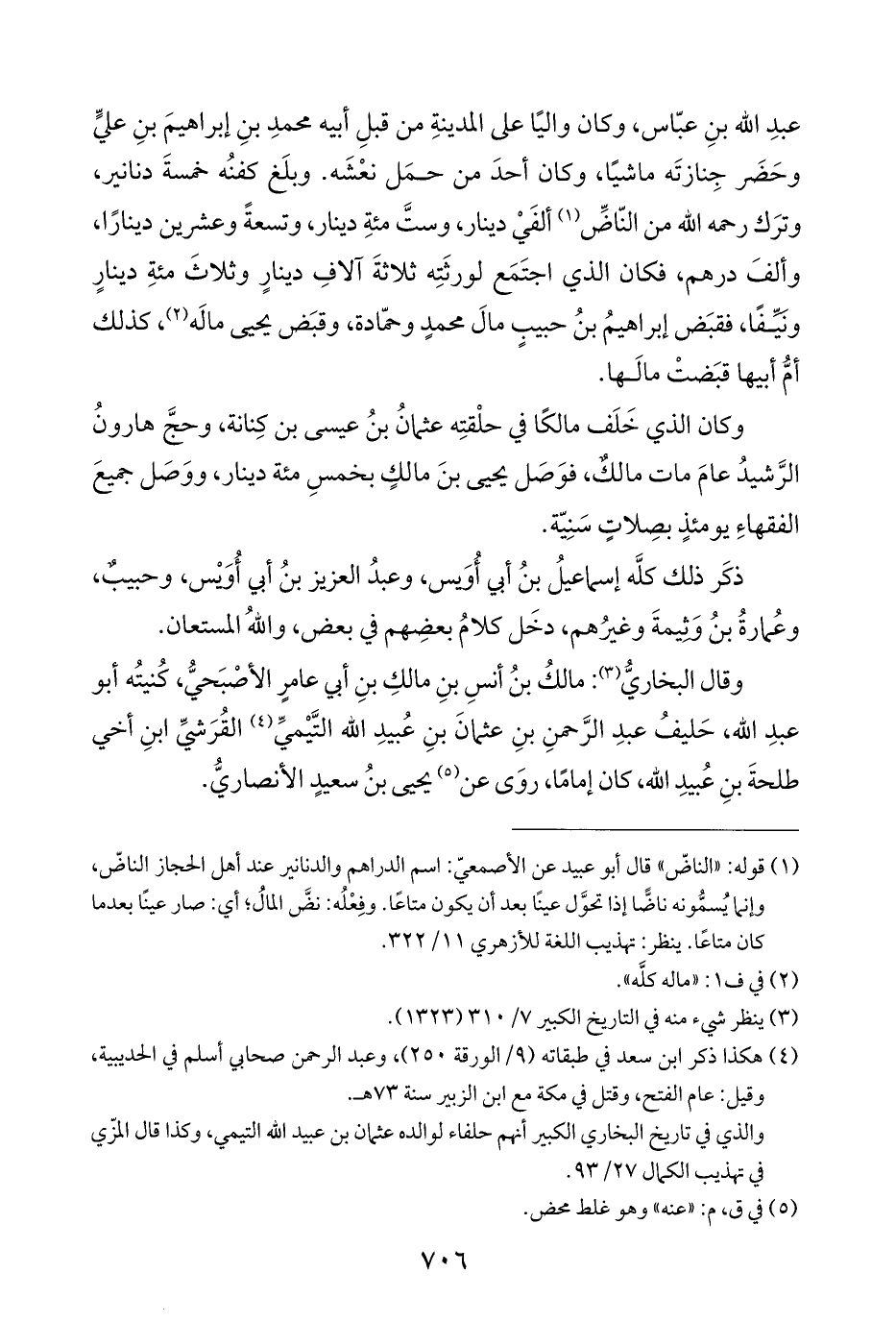 عبدِ الله بنِ عبّاس، وكان واليًا على المدينةِ من قبلِ أبيه محمدِ بنِ إبراهيمَ بنِ عليٍّ وحَضَر جِنازتَه ماشيًا، وكان أحدَ من حمَل نعْشَه. وبلَغ كفنُه خمسةَ دنانير، وترَك رحمه الله من النّاضِّ (¬١) ألفَيْ دينار، وستَّ مئةِ دينار، وتسعةً وعشرين دينارًا، وألفَ درهم، فكان الذي اجتَمَع لورثَتِه ثلاثةَ آلافِ دينارٍ وثلاثَ مئةِ دينارٍ ونَيِّفًا، فقبَض إبراهيمُ بنُ حبيبٍ مالَ محمدٍ وحمّادة، وقبَض يحيى مالَه (¬٢)، كذلك أمُّ أبيها قبَضتْ مالَها.