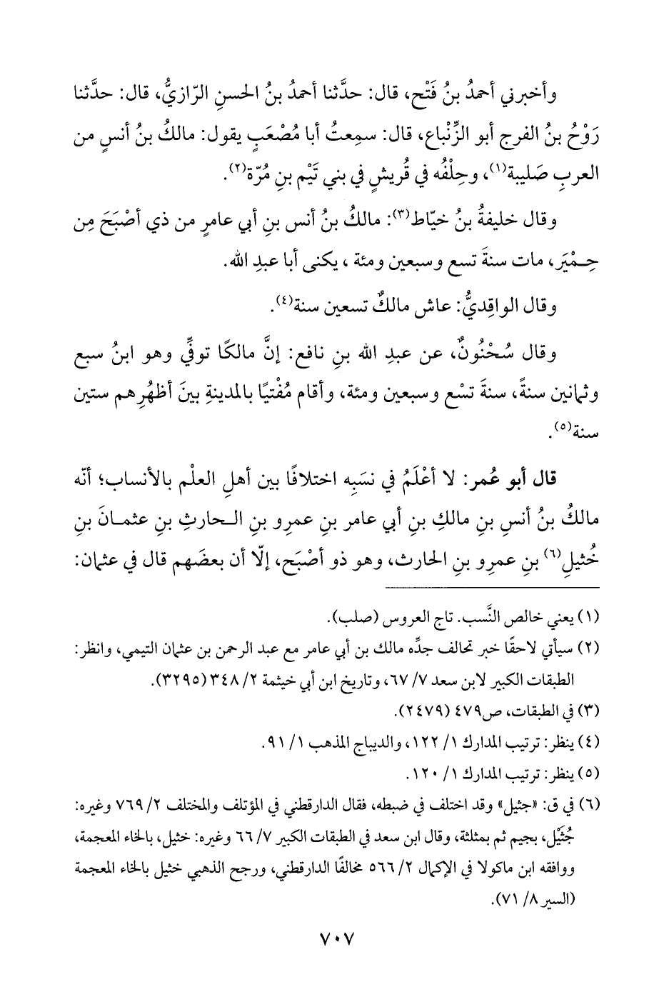 وقال خليفةُ بنُ خيّاط (¬٣): مالكُ بنُ أنس بنِ أبي عامرٍ من ذي أصْبَحَ مِن حِمْيَر، مات سنةَ تسع وسبعين ومئة، يكنى أبا عبدِ الله.