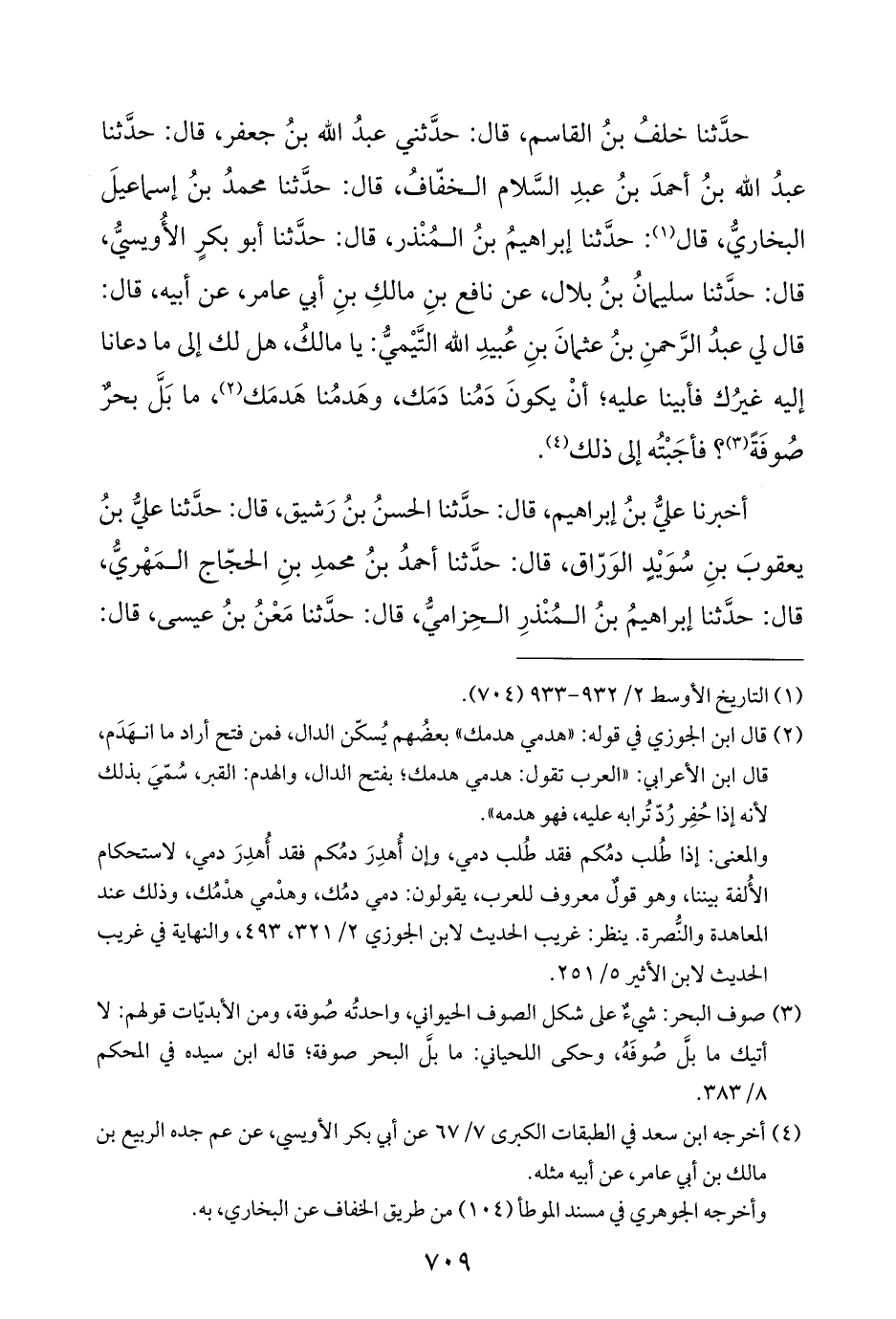 حدَّثنا خلفُ بنُ القاسم، قال: حدَّثني عبدُ الله بنُ جعفر، قال: حدَّثنا عبدُ الله بنُ أحمدَ بنُ عبدِ السَّلام الخفّافُ، قال: حدَّثنا محمدُ بنُ إسماعيلَ البخاريُّ، قال (¬١): حدَّثنا إبراهيمُ بنُ المُنْذر، قال: حدَّثنا أبو بكرٍ الأُويسيُّ، قال: حدَّثنا سليمانُ بنُ بلال، عن نافع بنِ مالكِ بنِ أبي عامر، عن أبيه، قال: قال لي عبدُ الرَّحمنِ بنُ عثمانَ بنِ عُبيدِ الله التَّيْميُّ: يا مالكُ، هل لك إلى ما دعانا إليه غيرُك فأبينا عليه؛ أنْ يكونَ دَمُنا دَمَك، وهَدمُنا هَدمَك (¬٢)، ما بَلَّ بحرٌ صُوفَةً (¬٣)؛ فأجَبْتُه إلى ذلك (¬٤).
