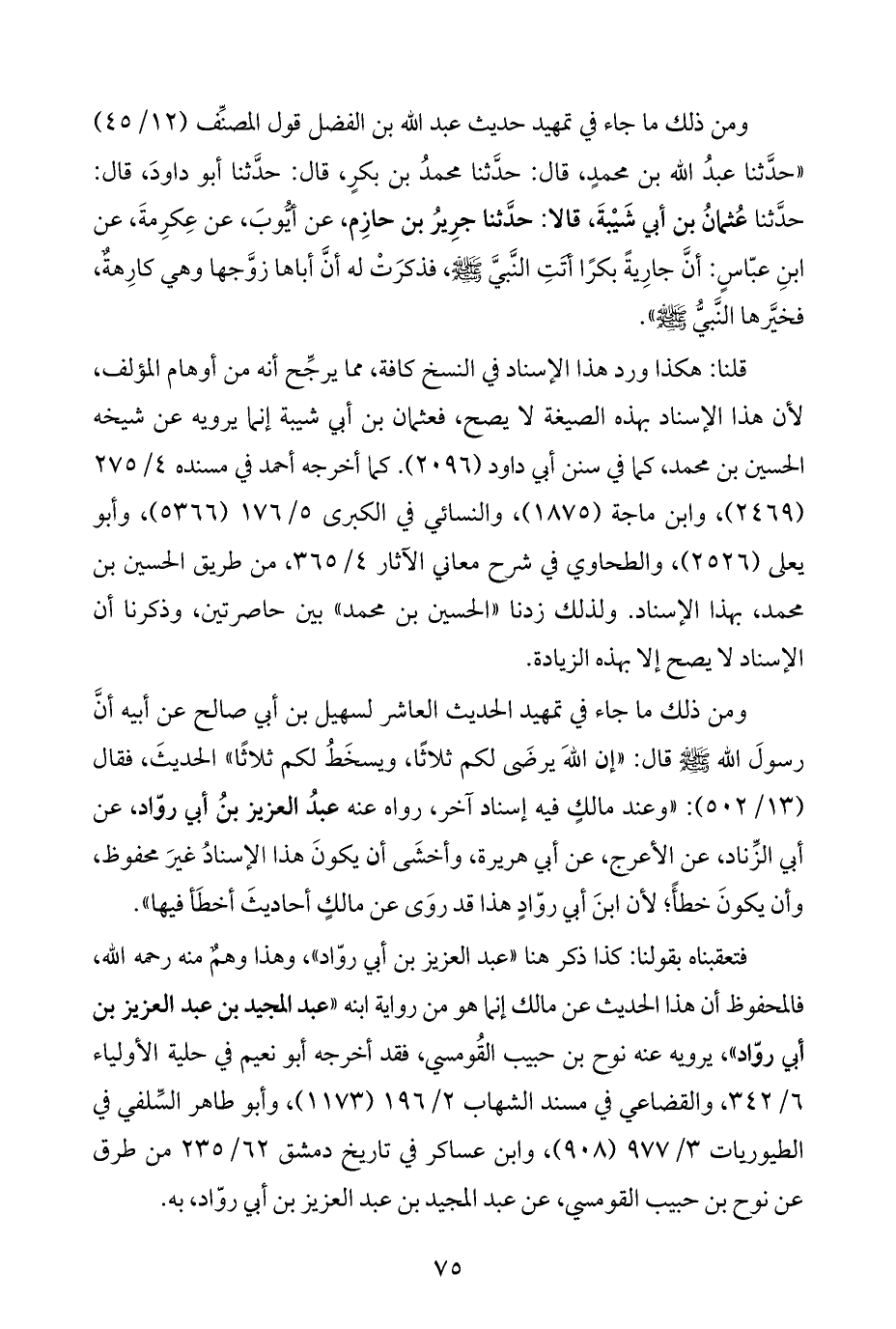 ومن ذلك ما جاء في تمهيد حديث عبد اللَّه بن الفضل قول المصنِّف (١٢/ ٤٥) "حدَّثنا عبدُ اللَّه بن محمدٍ، قال: حدَّثنا محمدُ بن بكرٍ، قال: حدَّثنا أبو داودَ، قال: حدَّثنا عُثمانُ بن أبي شَيْبةَ، قالا: حدَّثنا جرِيرُ بن حازِم، عن أيُّوبَ، عن عِكرِمةَ، عن ابنِ عبّاسٍ: أنَّ جارِيةً بكرًا أتَتِ النَّبيَّ -صلى اللَّه عليه وسلم-، فذكرَتْ له أنَّ أباها زوَّجها وهي كارِهةٌ، فخيَّرها النَّبيُّ -صلى اللَّه عليه وسلم-".