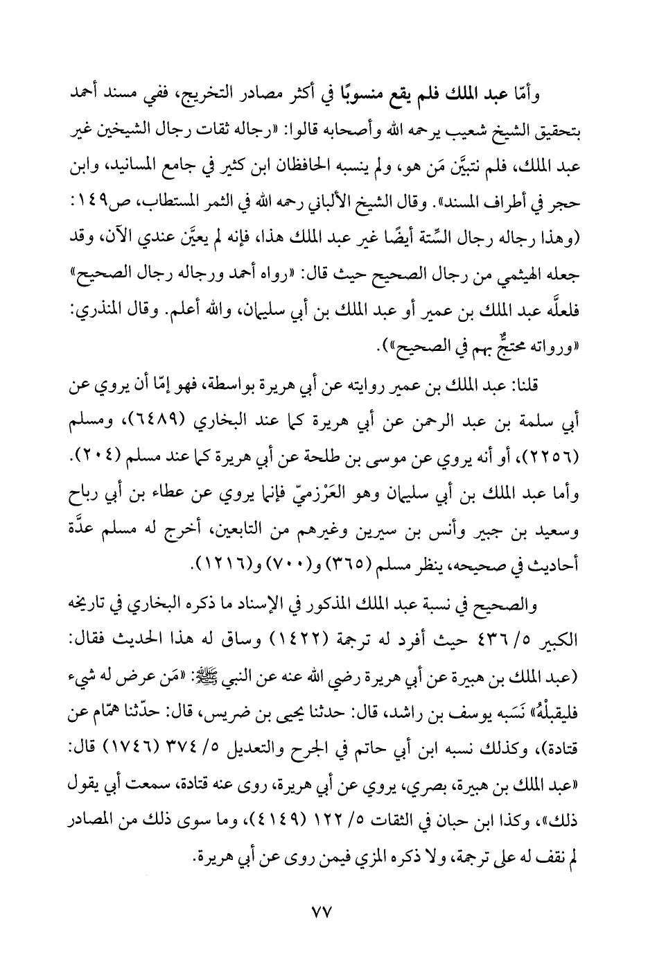وأمّا عبد الملك فلم يقع منسوبًا في أكثر مصادر التخريج، ففي مسند أحمد بتحقيق الشيخ شعيب يرحمه اللَّه وأصحابه قالوا: "رجاله ثقات رجال الشيخين غير عبد الملك، فلم نتبيَّن مَن هو، ولم ينسبه الحافظان ابن كثير في جامع المسانيد، وابن حجر في أطراف المسند". وقال الشيخ الألباني رحمه اللَّه في الثمر المستطاب، ص ١٤٩: (وهذا رجاله رجال السِّتة أيضًا غير عبد الملك هذا، فإنه لم يعيَّن عندي الآن، وقد جعله الهيثمي من رجال الصحيح حيث قال: "رواه أحمد ورجاله رجال الصحيح" فلعلَّه عبد الملك بن عمير أو عبد الملك بن أبي سليمان، واللَّه أعلم. وقال المنذري: "ورواته محتجٌّ بهم في الصحيح").