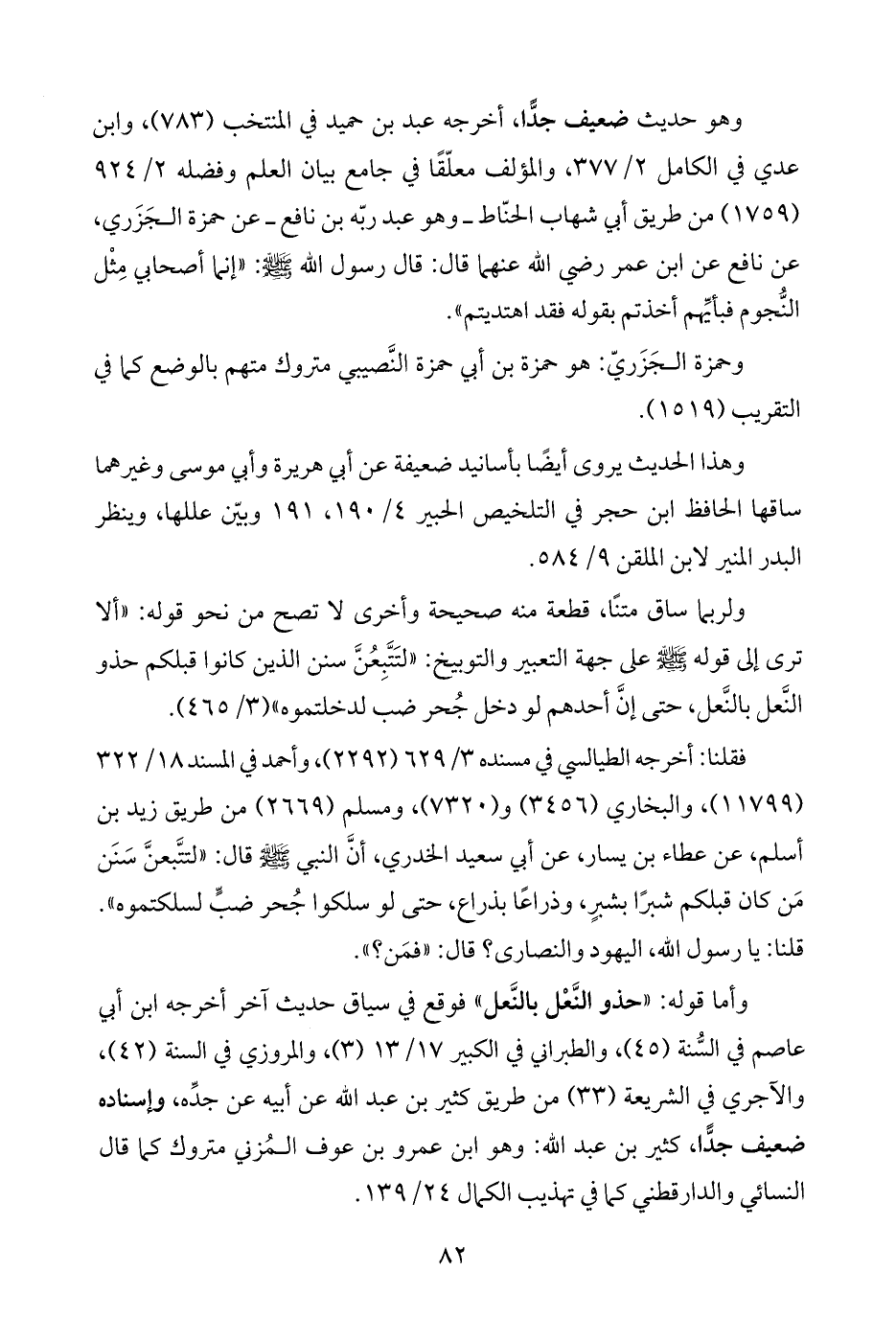 ولربما ساق متنًا، قطعة منه صحيحة وأخرى لا تصح من نحو قوله: "ألا ترى إلى قوله -صلى اللَّه عليه وسلم- على جهة التعبير والتوبيخ: "لتَتَّبِعُنَّ سنن الذين كانوا قبلكم حذو النَّعل بالنَّعل، حتى إنَّ أحدهم لو دخل جُحر ضب لدخلتموه" (٣/ ٤٦٥).